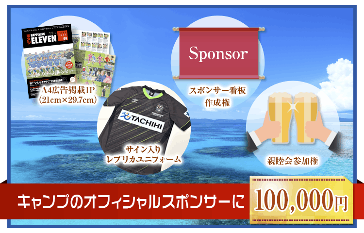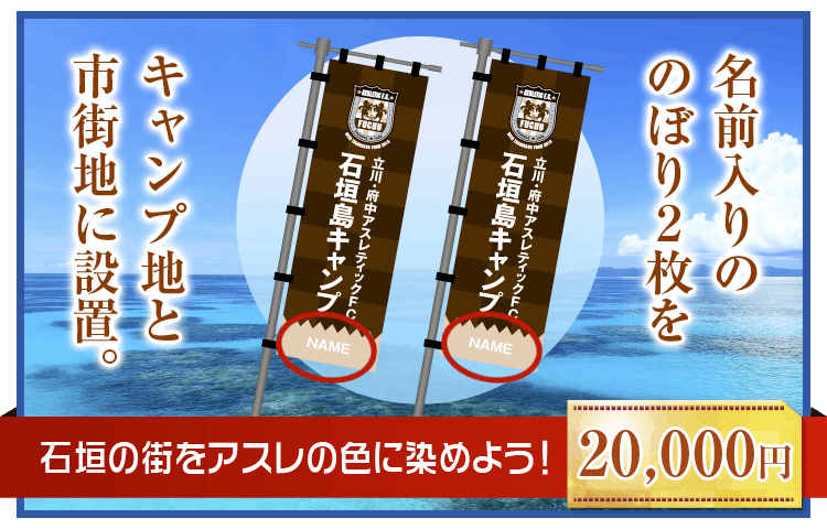キャンプ地となる石垣島の、市街地とキャンプ地をアスレカラーで染め上げましょう!お名前(企業名可)を入れたオリジナルのぼり旗を作成して、市街地と体育館のそれぞれに設置します。アスレを石垣島の皆にアピールして、フットサルの魅力を知って頂きましょう!
