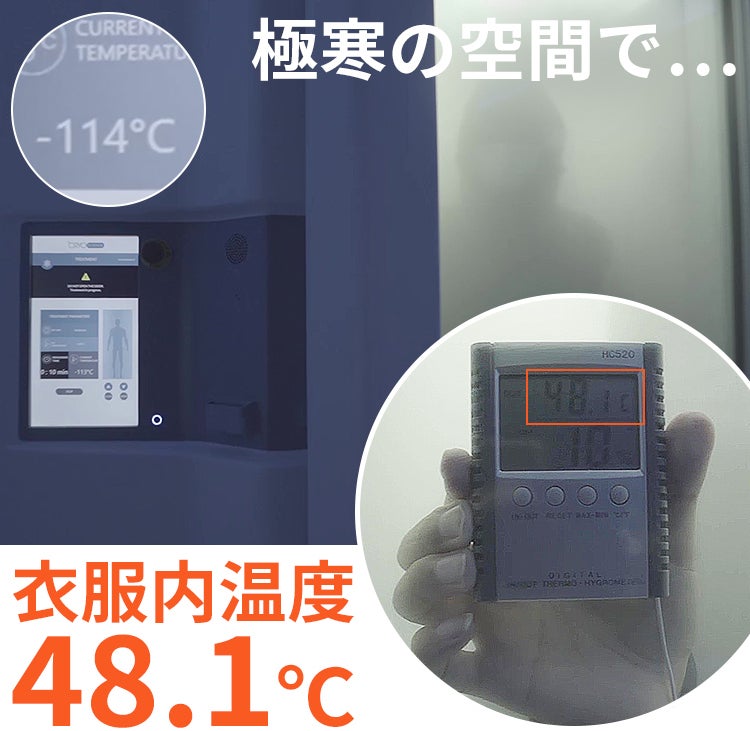 マイナス120℃の極寒環境で、発熱ダウンの着用実験を行いました。電源を入れ、発熱シートを前後53℃設定にすると、2分後には、衣服内温度がなんと最大48℃まで上昇!