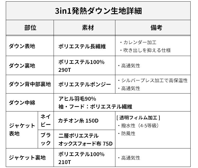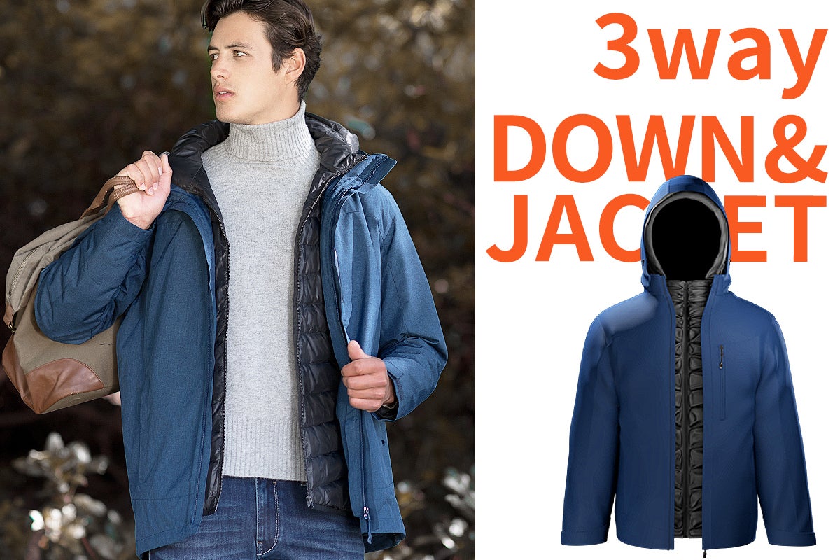 発熱ダウンとジャケットを重ねたデザインの3in1発熱ダウン。3通りの着回しが楽しめる優れものです。