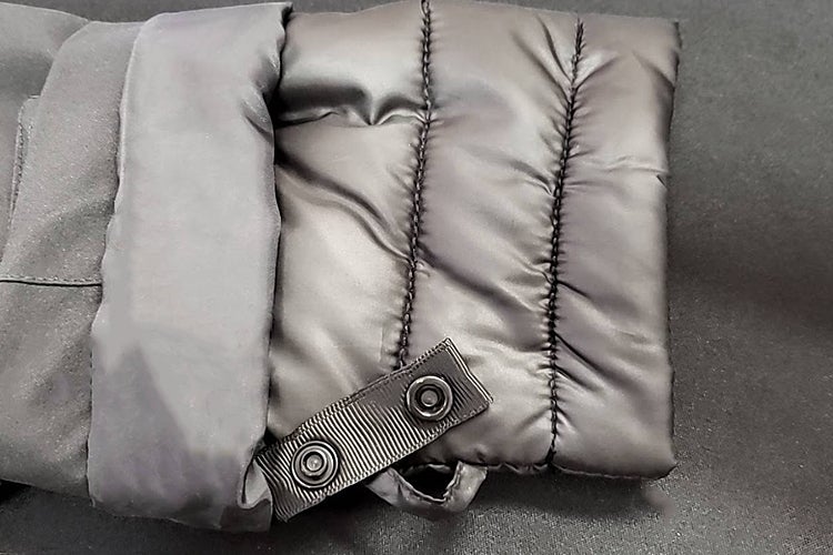 ジャケット内側にはボタンが、発熱ダウン袖口にはベルトがついておりますので、ボタンをベルトに通して留めていただくことで、袖部分も、しっかりと固定頂けます♪