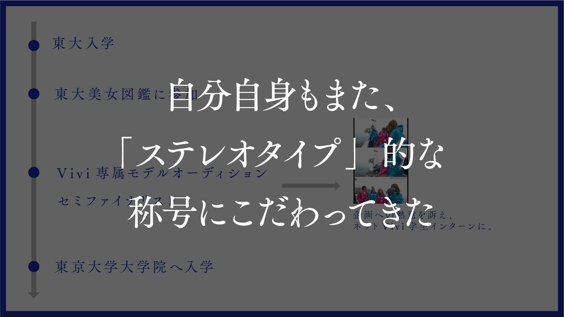 それでも、そうやって頑張ってきた自分を振り返ったときに、東大だとか、美女だとか、そんな『ステレオタイプ』的な称号を抜きにしたときの私らしさってなんだろうという疑問はずっと残り続けました。