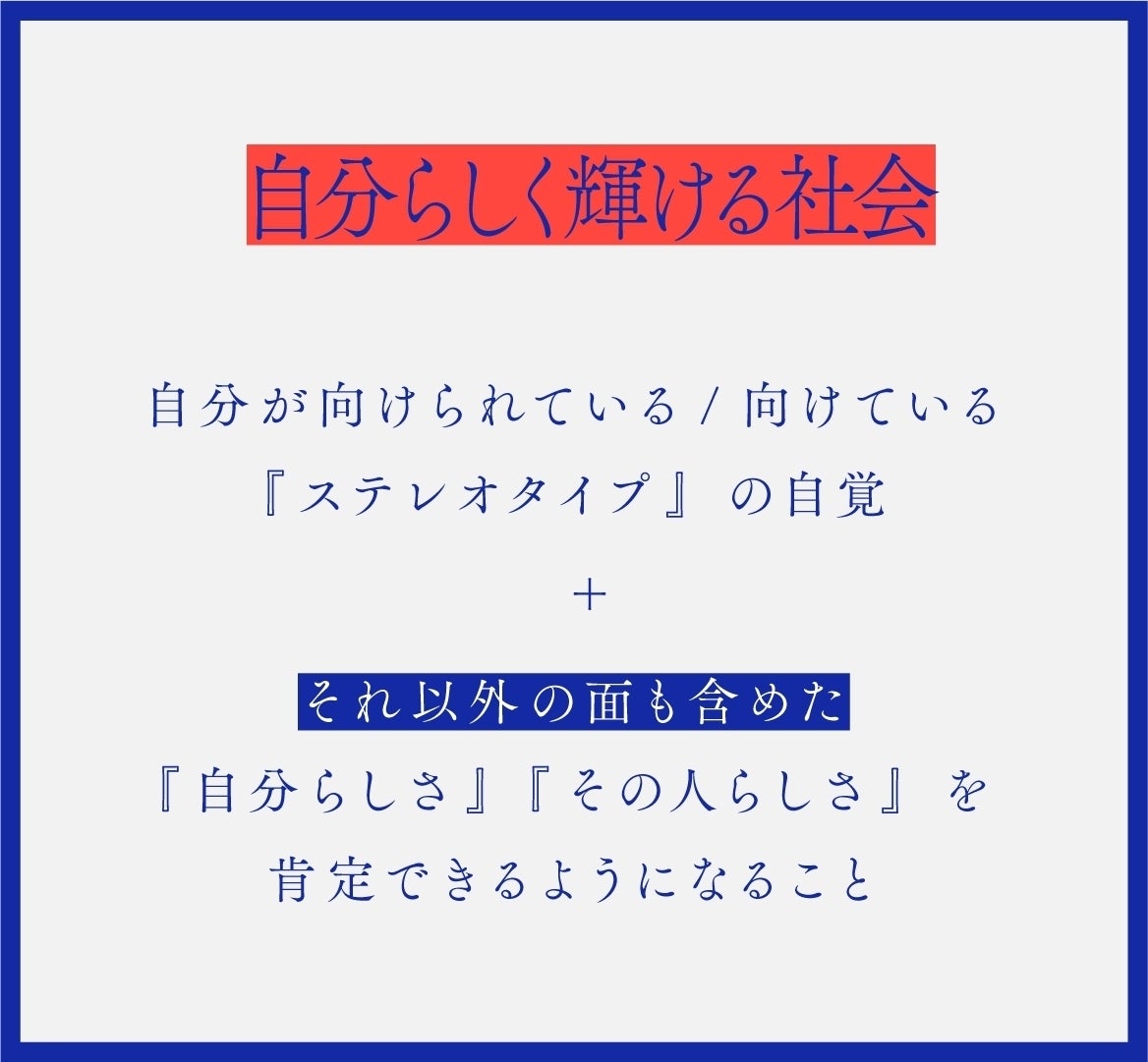 「みんな違ってみんないい」と本気で全ての人が思える世の中は、一人ひとりがしっかり自分自身や目の前の相手に対して持っている『ステレオタイプ』を自覚して、それを踏まえて相手の様々な面を受け入れることができるように対話・行動できる世の中だと今は考えています。