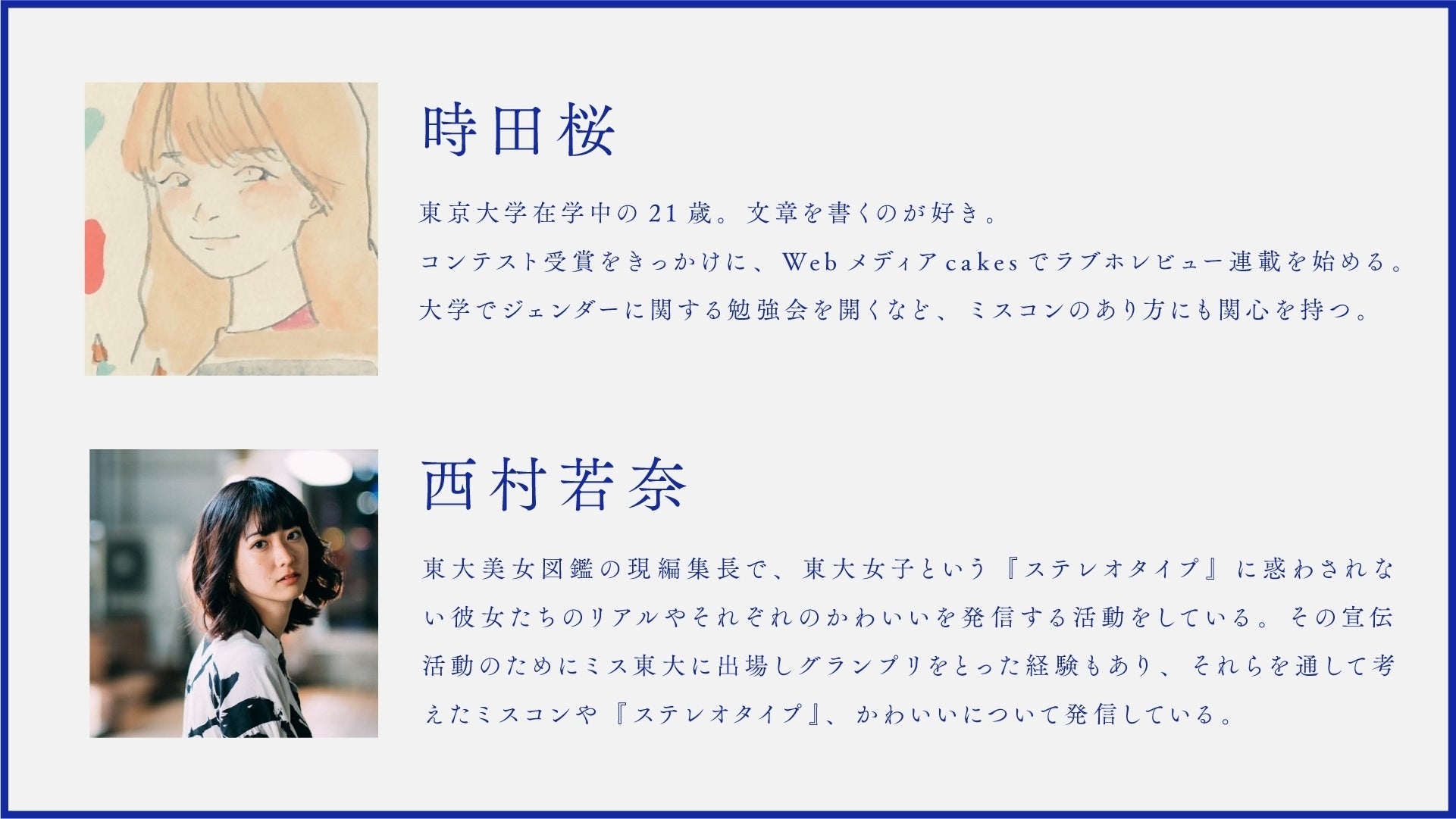 大勢の人の前に立つ彼女たちが、今のミスコンに対して何を思うのか。東大ミスコン当事者たちが、東大のミスコンを語る。ミスコン内部から、ミスコンを考えていき、ミスコンを新しい形に再定義していく。すごく面白いと思いませんか?と同時に彼女たちの例は、読む人それぞれにとっても自らの『ステレオタイプ』と『自分らしさ』それらとどう付き合っていくか考えるきっかけになると思っています。