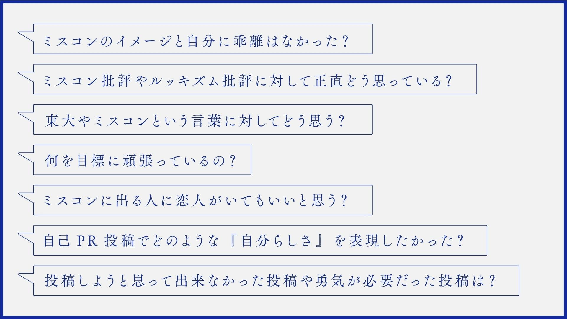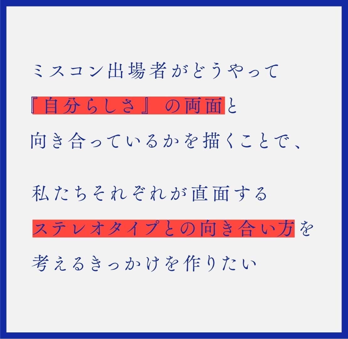冒頭にも書いたとおり私は「自分らしさ」や『ステレオタイプ』にずっとモヤモヤした想いを抱えてきました。同時にミスコン参加者の友人が多かったこともあり、ミスコン内部からミスコンのあり方を積極的に考えていく場を作り、発信していくプロジェクトができないかという思いもありました。