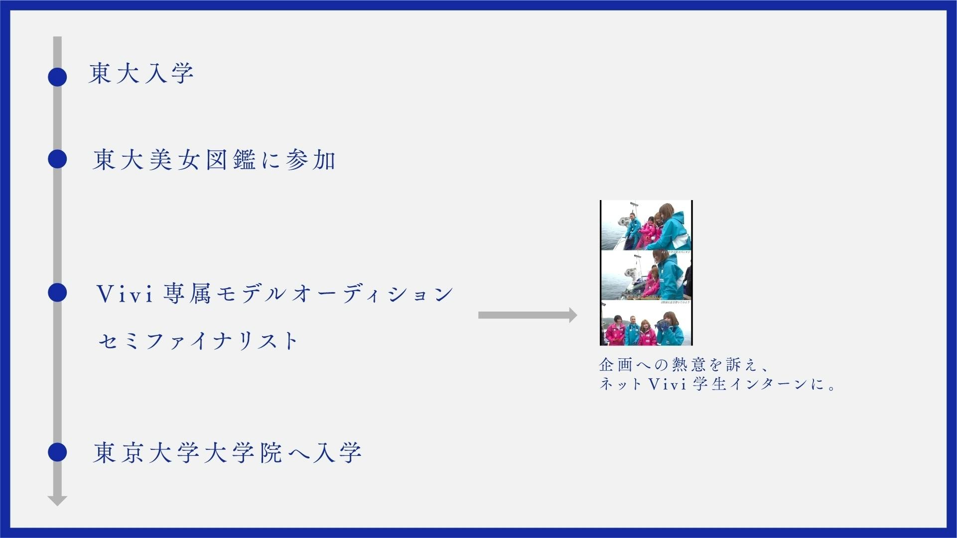 私は一浪の末、東京大学に入学した後、雑誌ViViの専属モデルオーディションに出場し、セミファイナルまで残った経験があります。また去年まで『東大美女図鑑』という東大の学生が主体で作る写真集にもモデルとして参加していました。