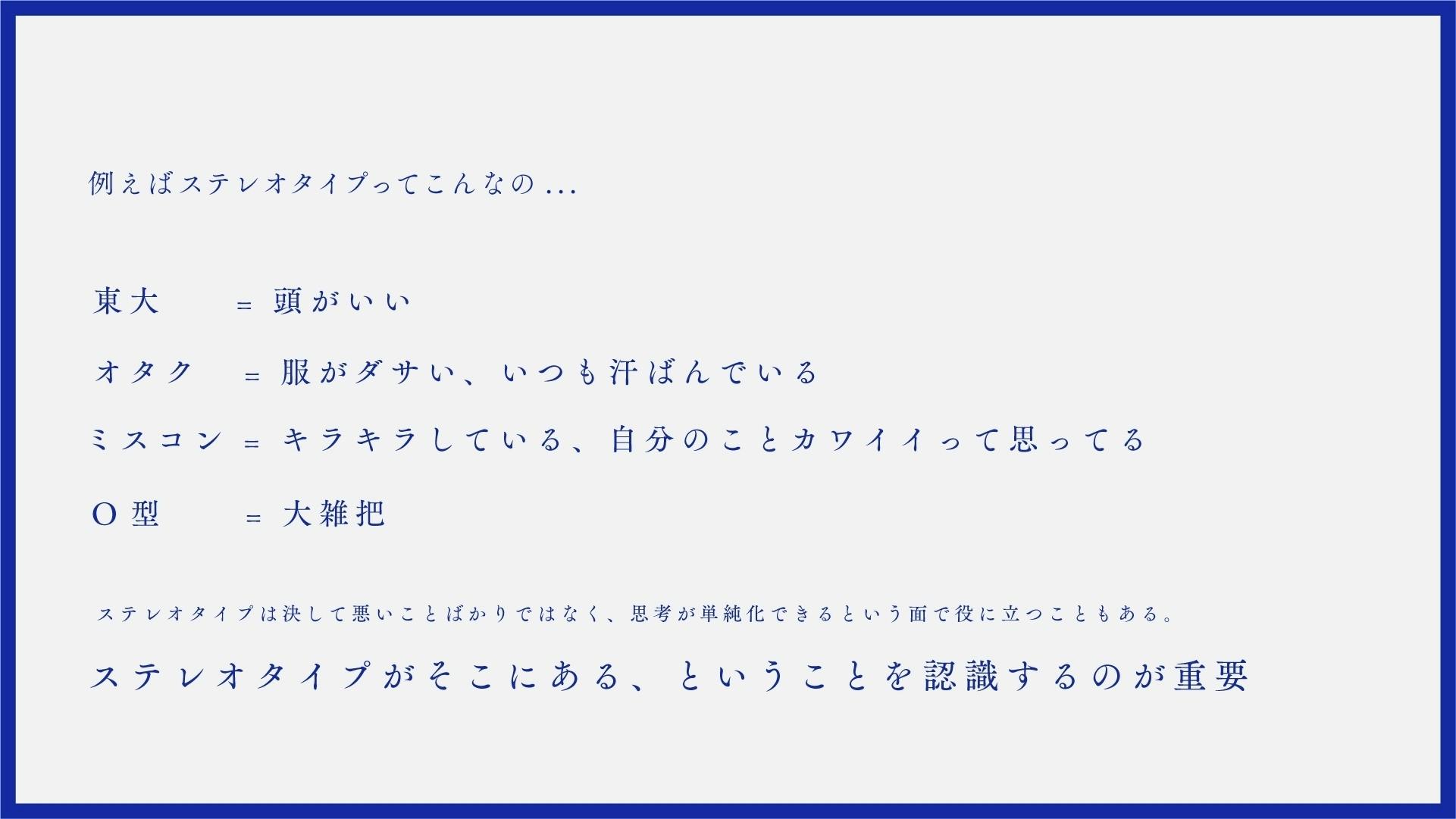 でもそこにある、ということは知っていて欲しい。「自分らしさ」にモヤっとしたことがある人にはその原因かもしれない『ステレオタイプ』にもっと自覚的であって欲しい。