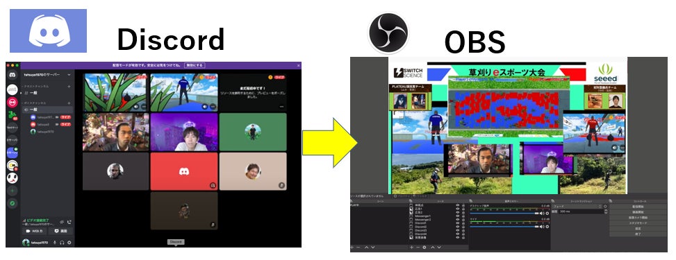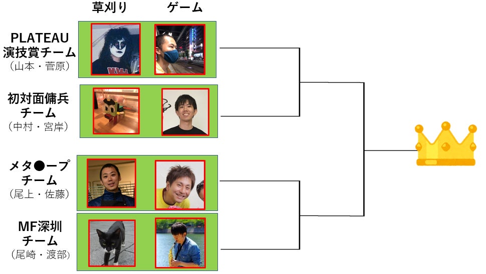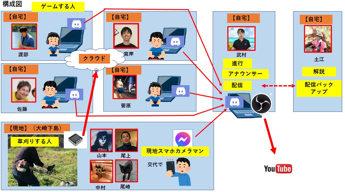 ゲームする人4人、草刈りする人4人、司会(配信)1人、解説者1人