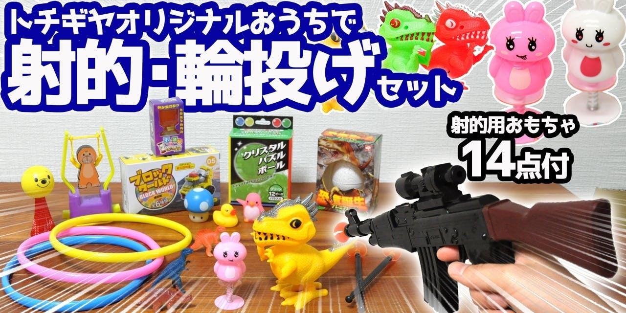 こちらもコロナの影響を受ける中、新たに生まれた商品をアレンジして射的も輪投げも同時に楽しめるセットにしました。射的として「吸着マシンガン」を使った射的や輪投げでおもちゃをゲットするゲームです。おもちゃも1つ1つ楽しく遊べるものを集めております。