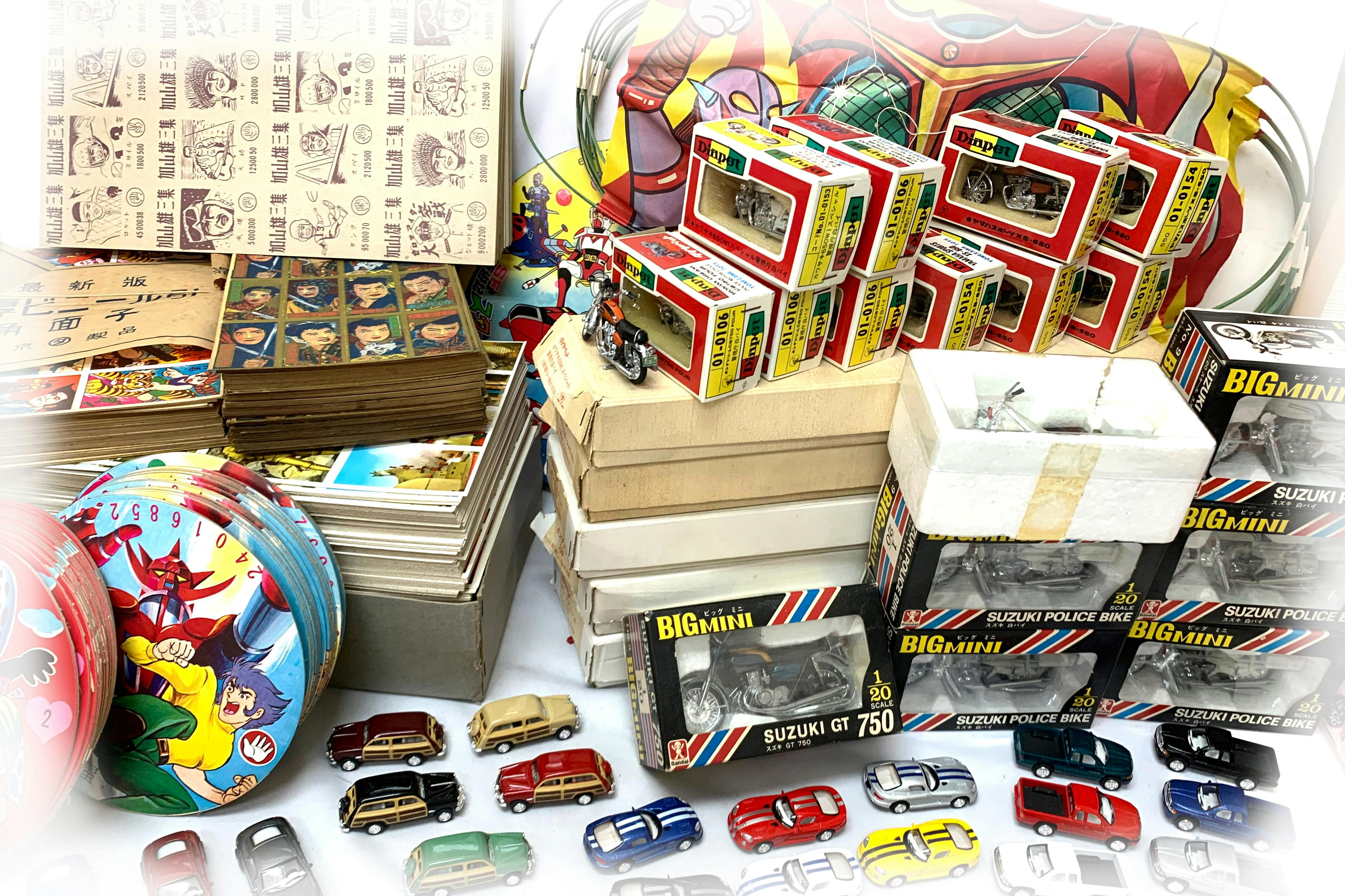 - 創業64年になりますので、昭和30年代の当時流行った「おもちゃ」(面子、ダイキャストカー、奴凧など)が今でも沢山残っております。