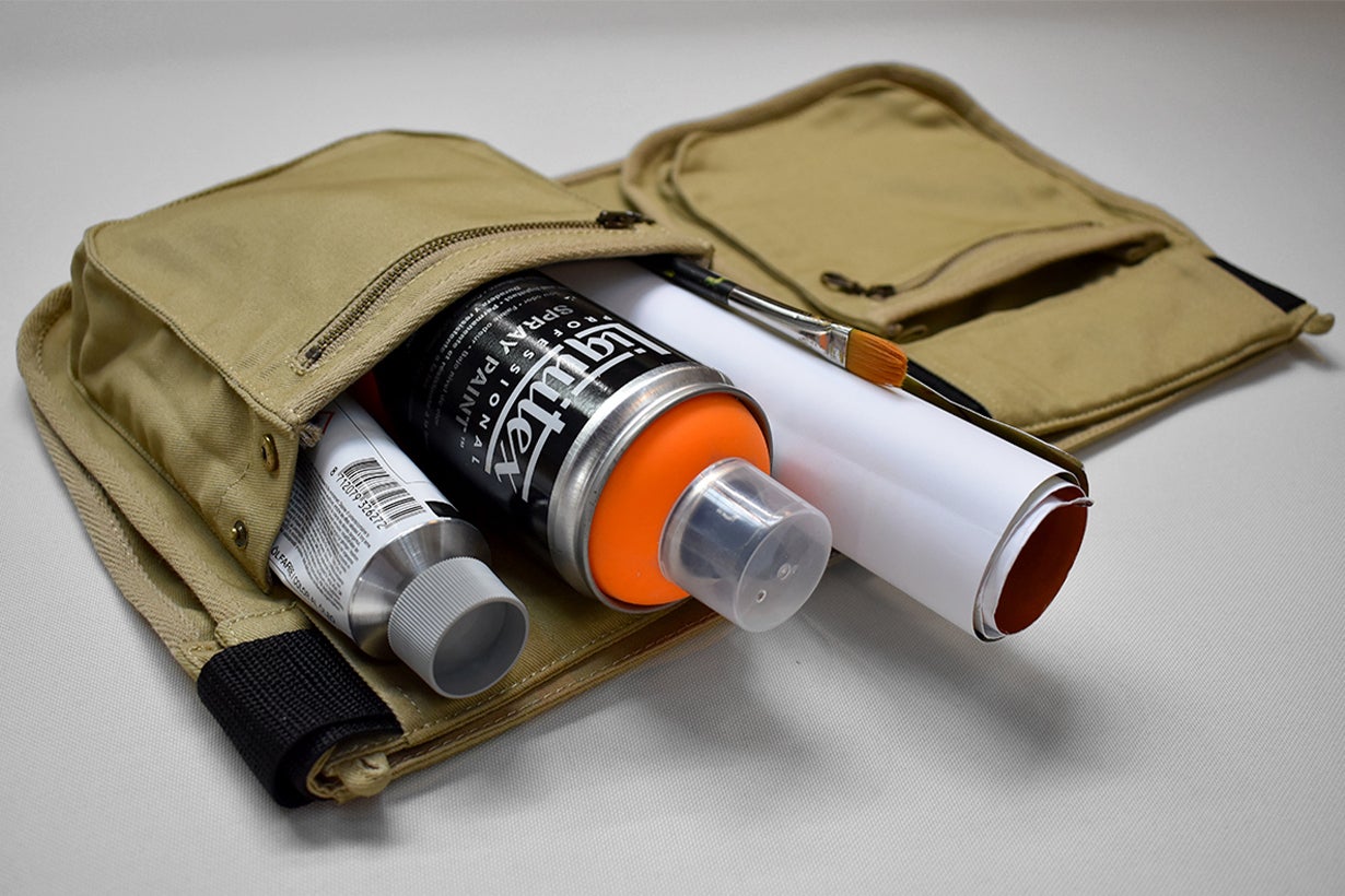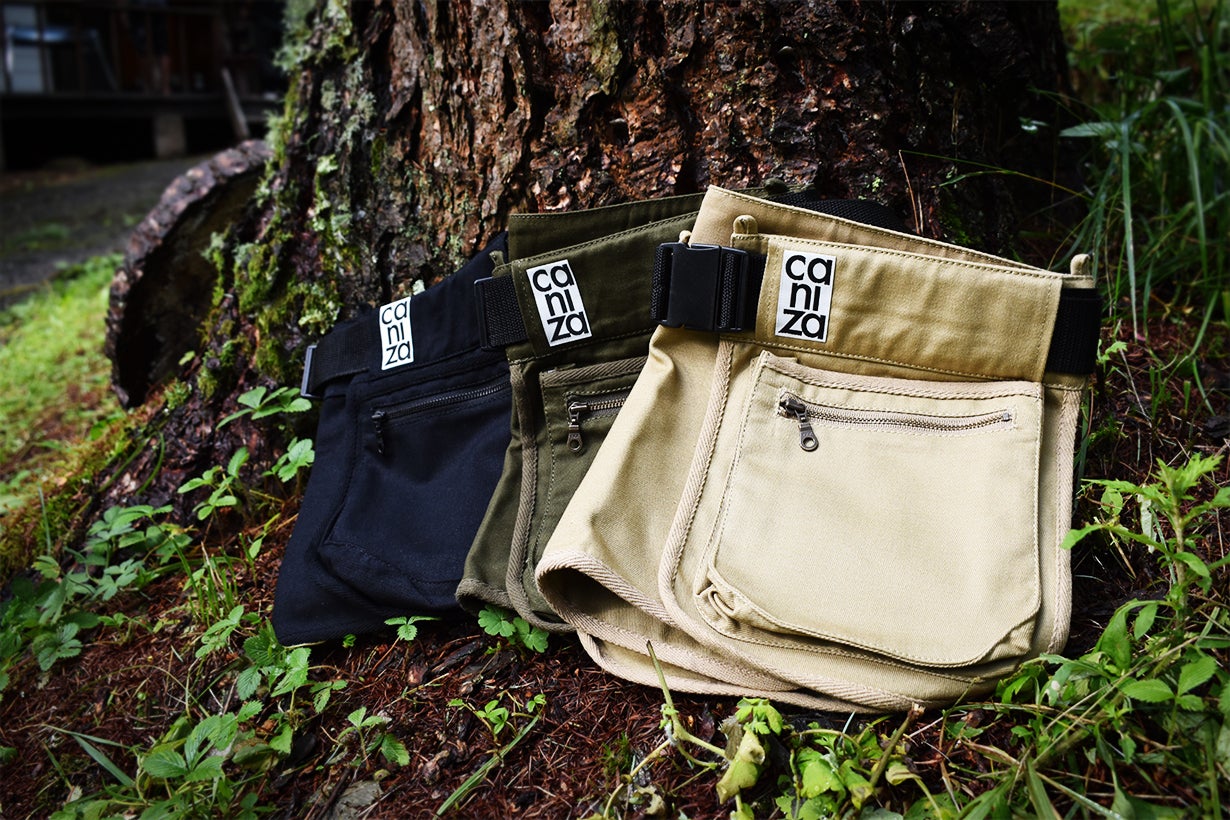 元は射撃用として使用されていたハンティングエプロンをリデザインし、日常的に使用するスマートフォンや財布などを収納するのに便利なウェアラブルマルチポケットに仕上げました。