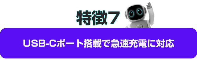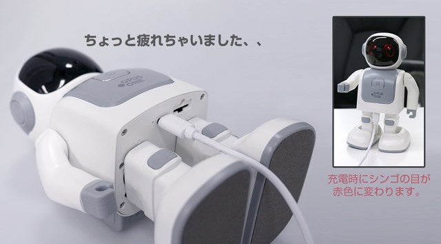 「踊るロボットスピーカーシンゴ」は、USB-Cポート(5V/2A)搭載で急速充電に対応し、約2.5時間で本体へ満充電が可能です。