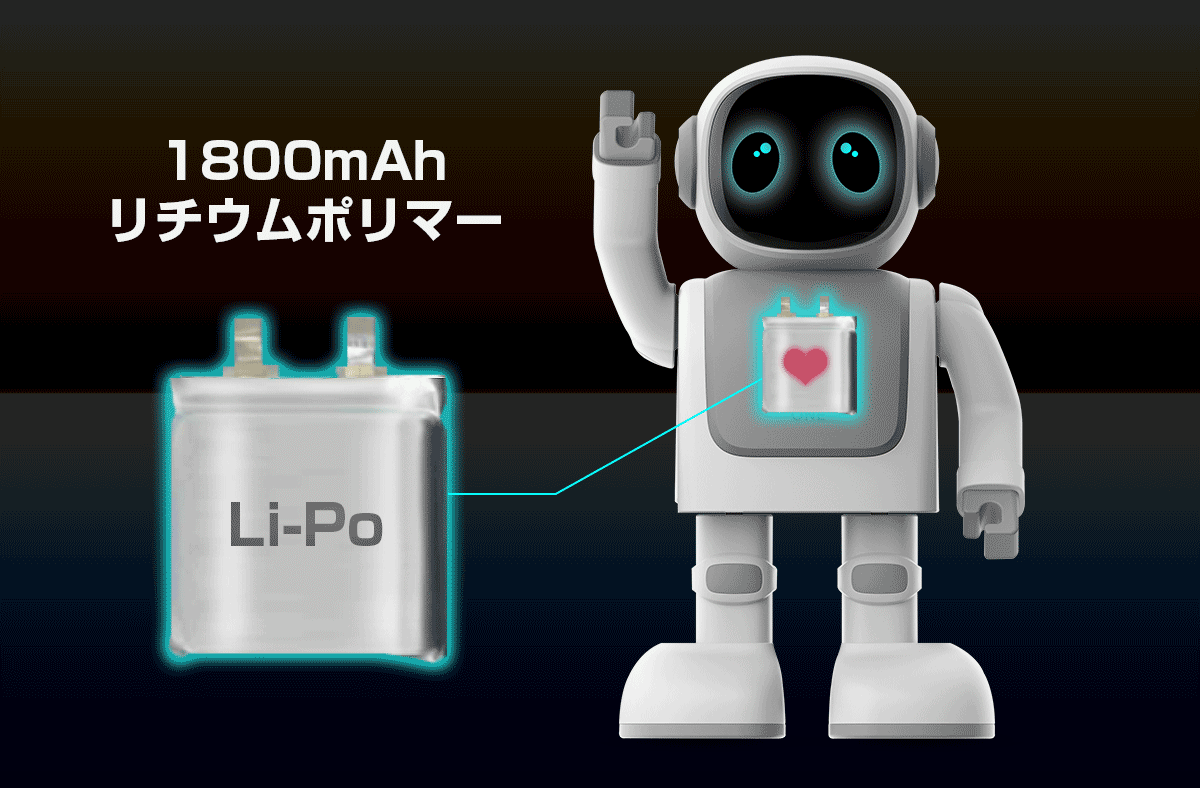「踊るロボットスピーカーシンゴ」は、一般的なリチウムイオンバッテリーで構成せずに、安全で高価なリチウムポリマー単一電池(1,800mAh)を搭載しています。