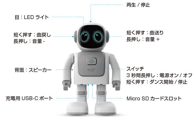 「踊るロボットスピーカーシンゴ」の頭を軽くタッチすると、音楽が再生または停止します。