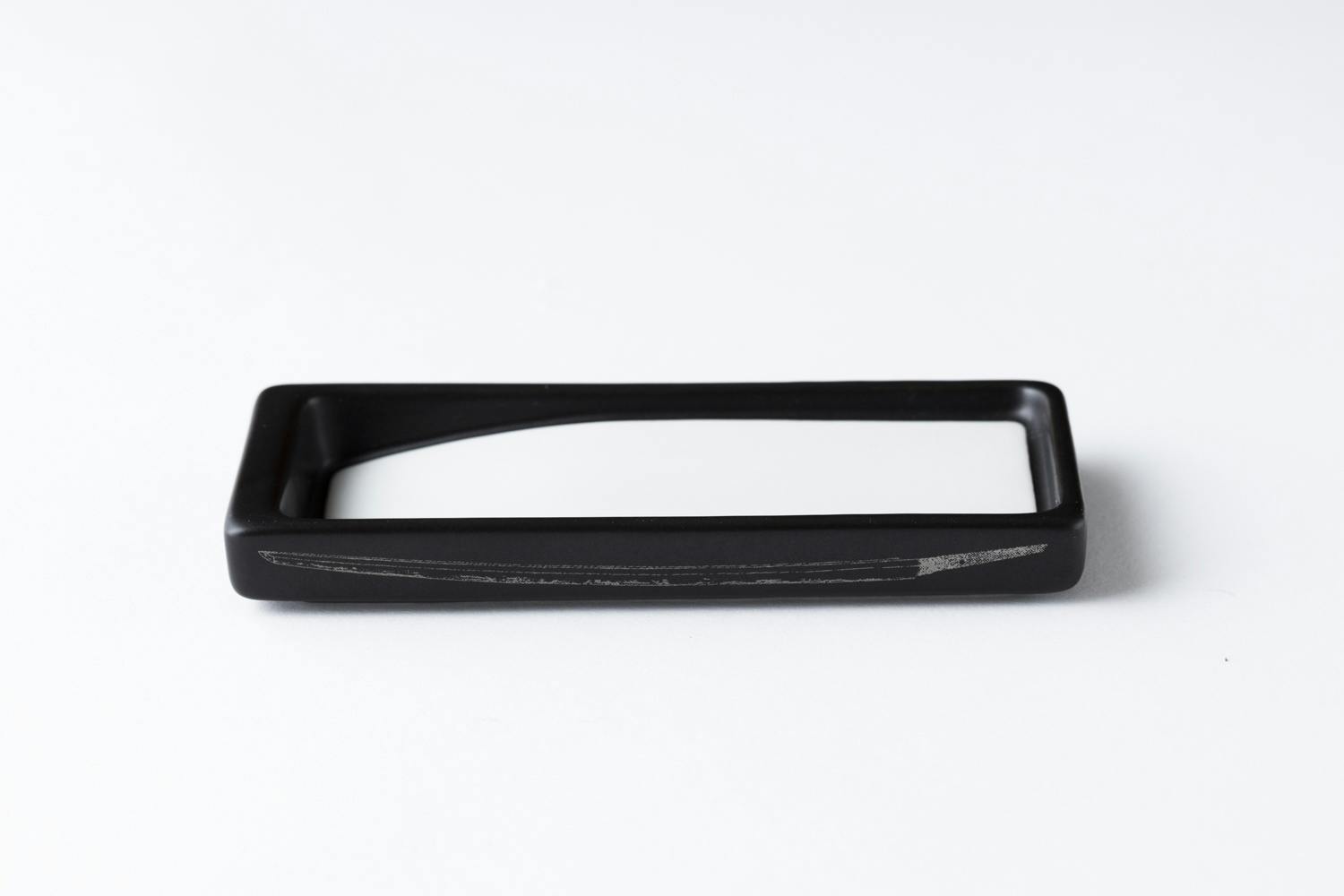 日本刀の魅力を最大限に硯に描くために試行錯誤をする中で《黒い硯とプラチナに輝く刀の押形》の組み合わせにたどり着きました。今回、硯に施した刀の絵柄は国宝に指定されている天下五剣のひとつ「三日月宗近」です。