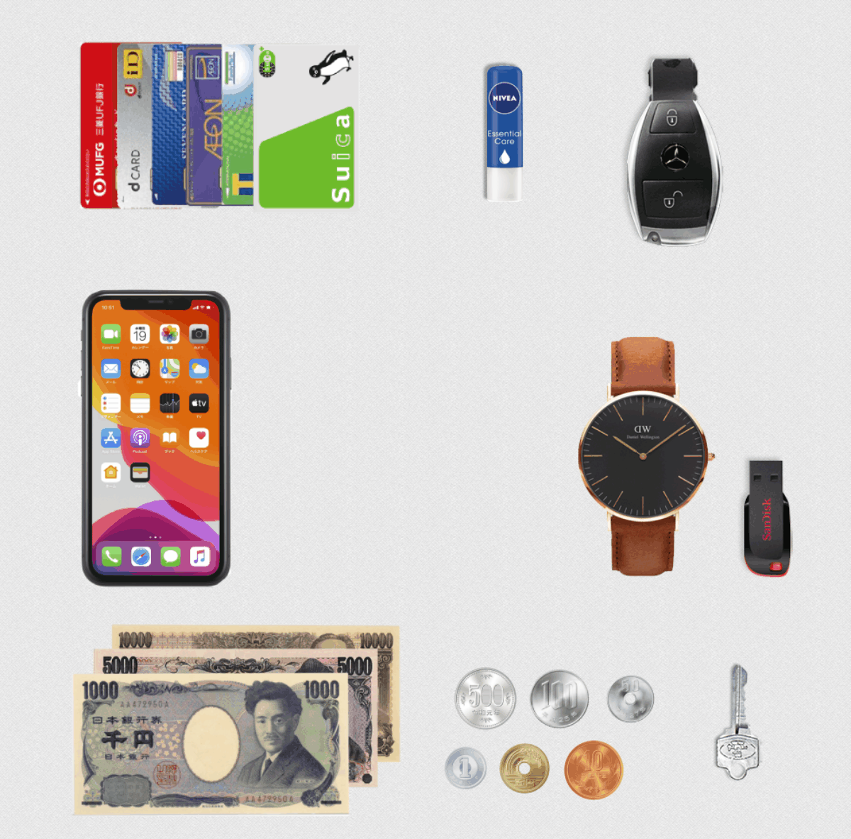 家や自動車のキーも持たなければなりません。