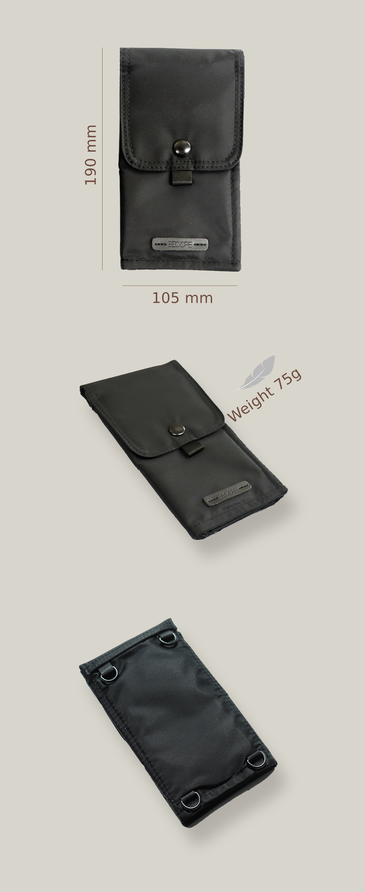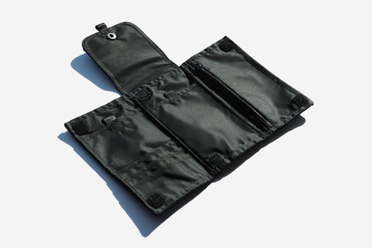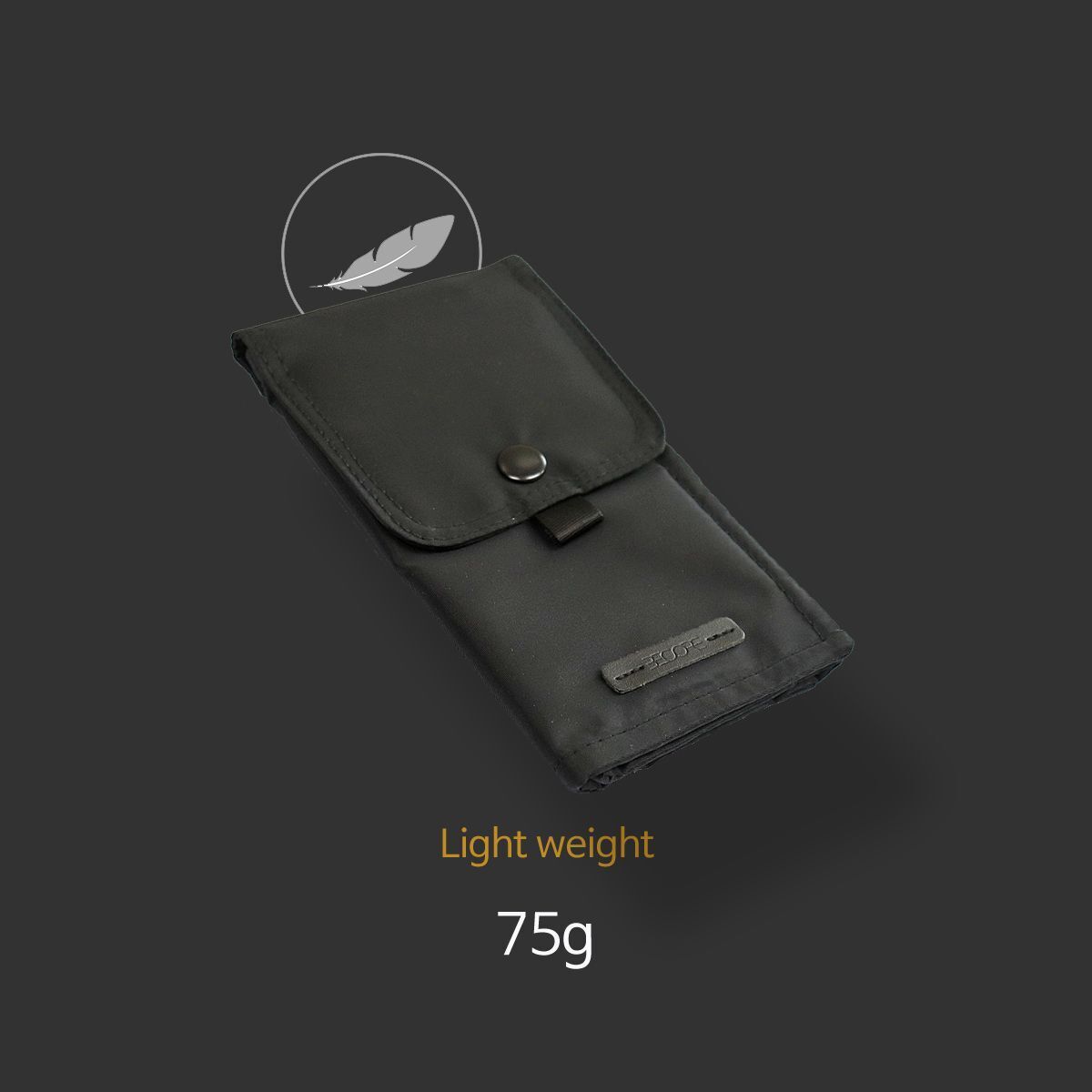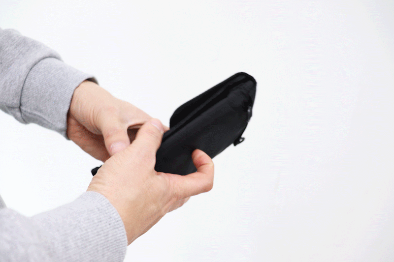 そんなスタイルデザインの豊富なバリエーションを持つ『ウォレット・スリング』ですが、重さ75gと非常に軽く、厚さ9㎜というコンパクトさでありながら、外傷に強く、撥水性のある大変丈夫なナイロン素材生地を採用しています。