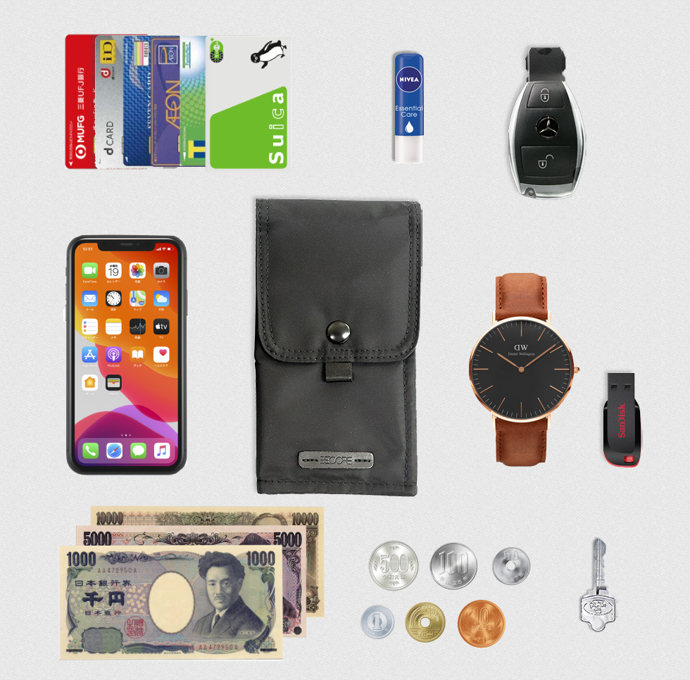 収納するのは、スマホだけでなく紙幣、コイン、カード類はもちろん、各種キーやその他のお出かけ必需品をすっぽり収納できます。