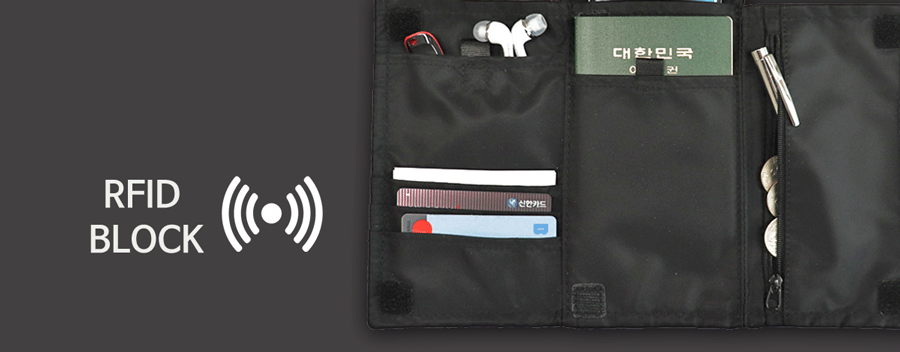 『ウォレット・スリング』のカード収納スペースには、スキミング防止機能を持つ RFIDブロック素材が入っているので旅行中のカード携帯も安心です。