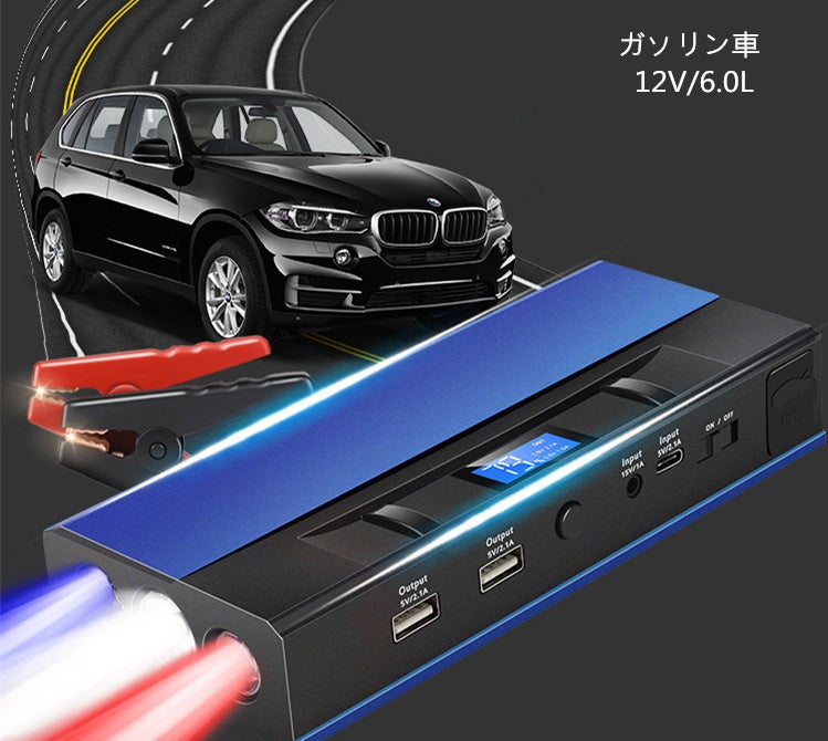 超大容量な28000mAh、最大ピーク1200Aの電流で6.0Lまでのガソリンカー/4.0Lのディーゼルかーに対応しています。一回フル充電で約30回以上のジャンプスタートできます。ジャンプスターターとしては強力なパワーです。