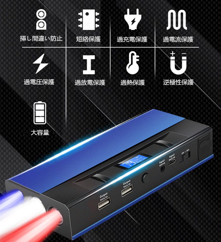 逆極性保護、過熱保護、過放電保護、逆充電保護、過充電保護、短絡保護、過電圧保護 過電流保護などの8つの内蔵保護を備えたスマートジャンパーケーブルを付けて、初心者も安全に使用できます。