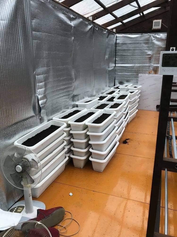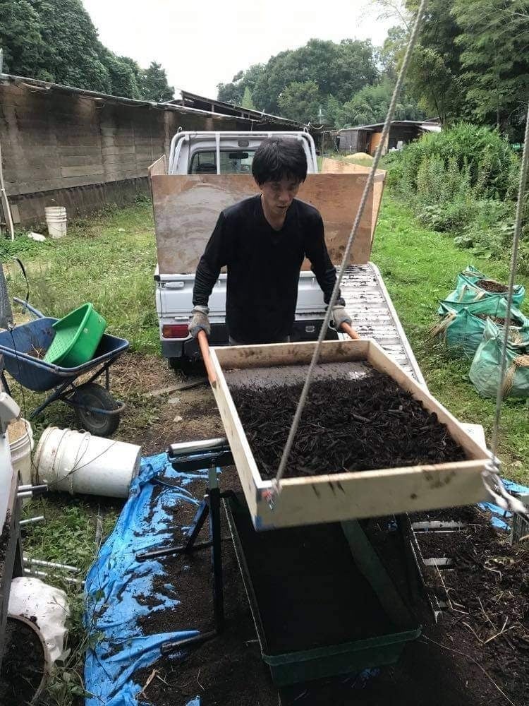 プランター120個に入れる土をふるいにかけて入れる作業