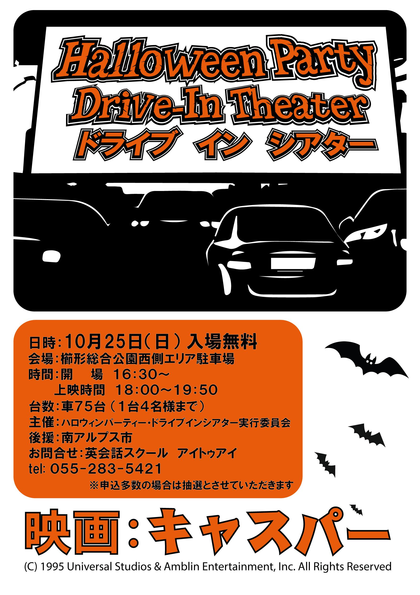 私たちハロウィンパーティ・ドライブインシアター実行委員会は、英会話スクールアイトゥアイを中心として、 南アルプス市や市民活動センターさん、塩山シネマさんにご協力いただきながら、ドライブインシアター実現に向け立ち上げられました。