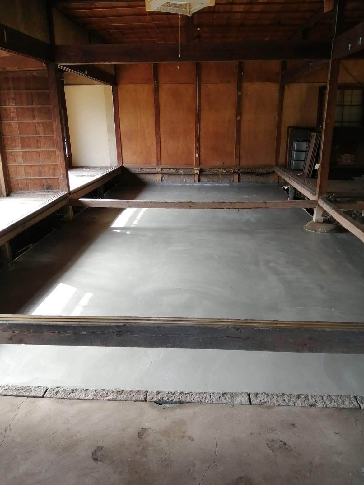 長い間物置として使われていたので、電気や水道も通っていませんでした。地元工務店に依頼し、上下水道、電気の整備、コンクリート打設工事、柱の補修などを行いました。