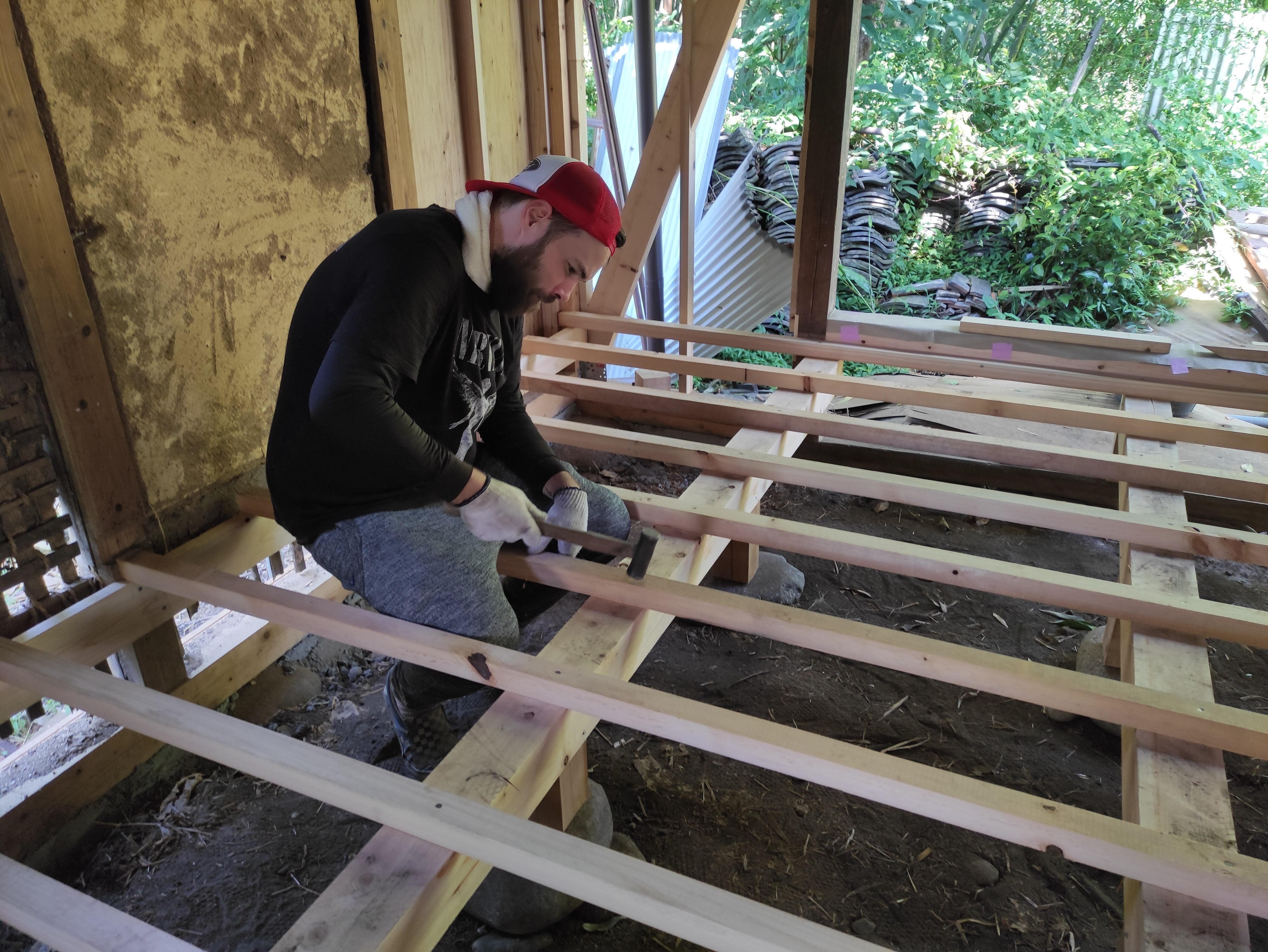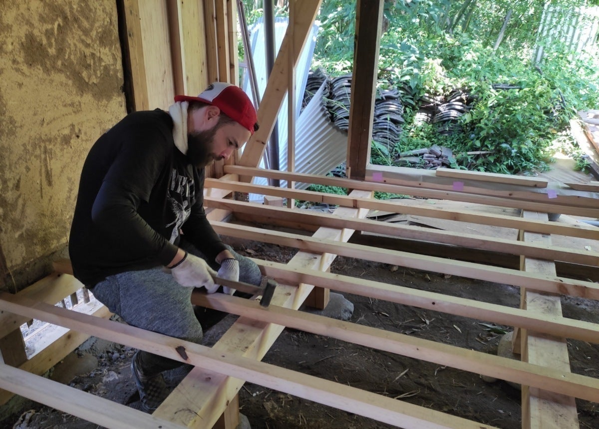 大工に教わりながら床の下地を作るアレックス