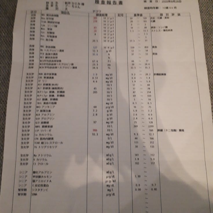 これまでの検査の数値は以下です。LIP数値は下がってきているものの、白血球が多くなっている。