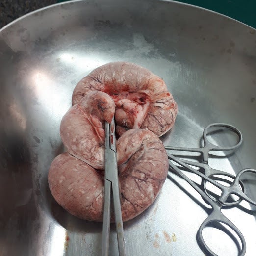 本日、医院のお昼休みの時間帯に手術を行うという段取りでしたが、心臓の様子、呼吸の様子をみて、本日の夜の手術になりました。その間も、万が一がある・・・というご説明をいただき、助かる可能性があるのならということで承諾しました。21時過ぎ、(子宮摘出手術は無事に終わりました!)と、電話がありました。後日見せていただいたもの・・・・。苦手な方はスルーして下さい。