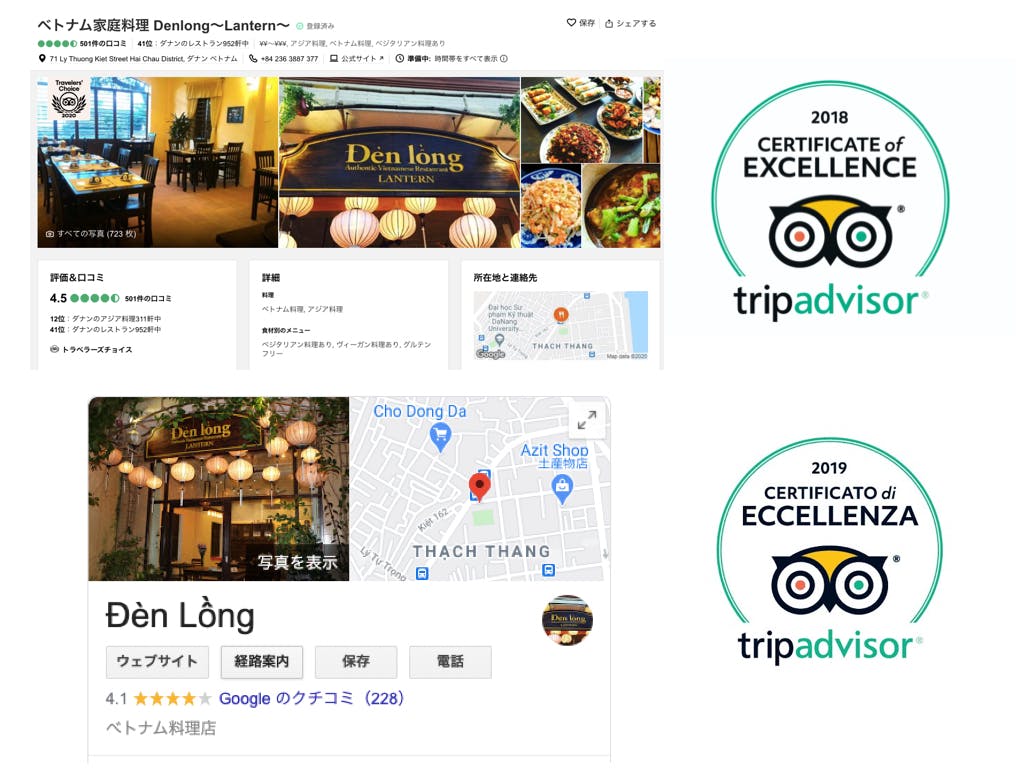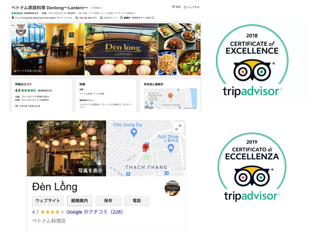 Denlongの全ての料理は、ホイアン出身のベトナム人シェフSauが作る化学調味料不使用・無添加のベトナム中部家庭料理を提供しています。ベトナムの伝統的な家庭料理の味を大事にしながら、海外の方でも食べやすい料理となっております。ベトナム料理は、生春巻きやフォーなどをイメージされますが家庭料理は、本当にいろいろな料理があります。特にダナンは、海があるため新鮮なシーフードなどもとても美味しいです。オープン以来、世界中から多くのお客様に楽しんでもらい、観光媒体や観光サイトでも取り上げてもらっています。 多くのお客様から高い評価を得ることができ、Googleでは4.1の評価を得ています。特にTripAdvisorでは、4.5の評価をもらいながら、2019年「CERTIFICATE of EXCELLENCE」、2018年「CERTIFICATE of EXCELLENCE」2017年「CERTIFICATE of EXCELLENCE」を受賞しています。
