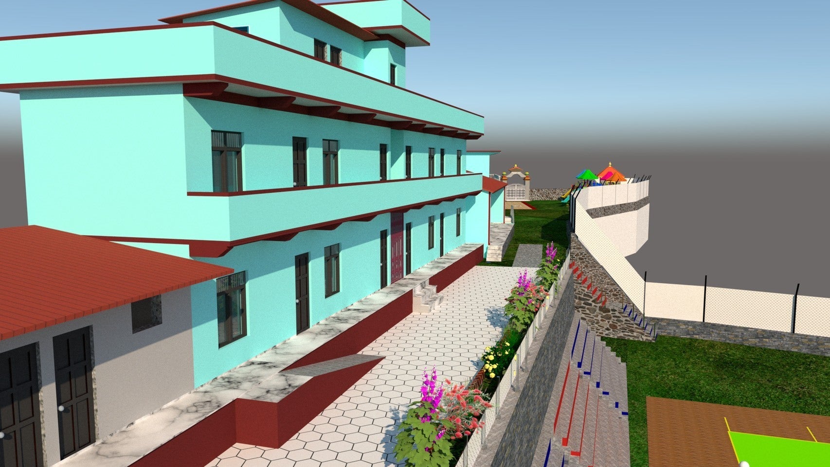 この地域は、モンスーンになると⼟砂⾬が続き、⽔はけも悪く、泥まみれになります。校舎内にも泥が入ってしまい、そこらじゅう泥だらけになってしまいます。そのため、グランドに⼈⼯芝を引き、泥が校 舎内に⼊ることを防ぎます。また、⽇本の学校のように、校舎の内外にできるだけ⽔道を設置し、⼿洗い、うがいを習慣化させます。