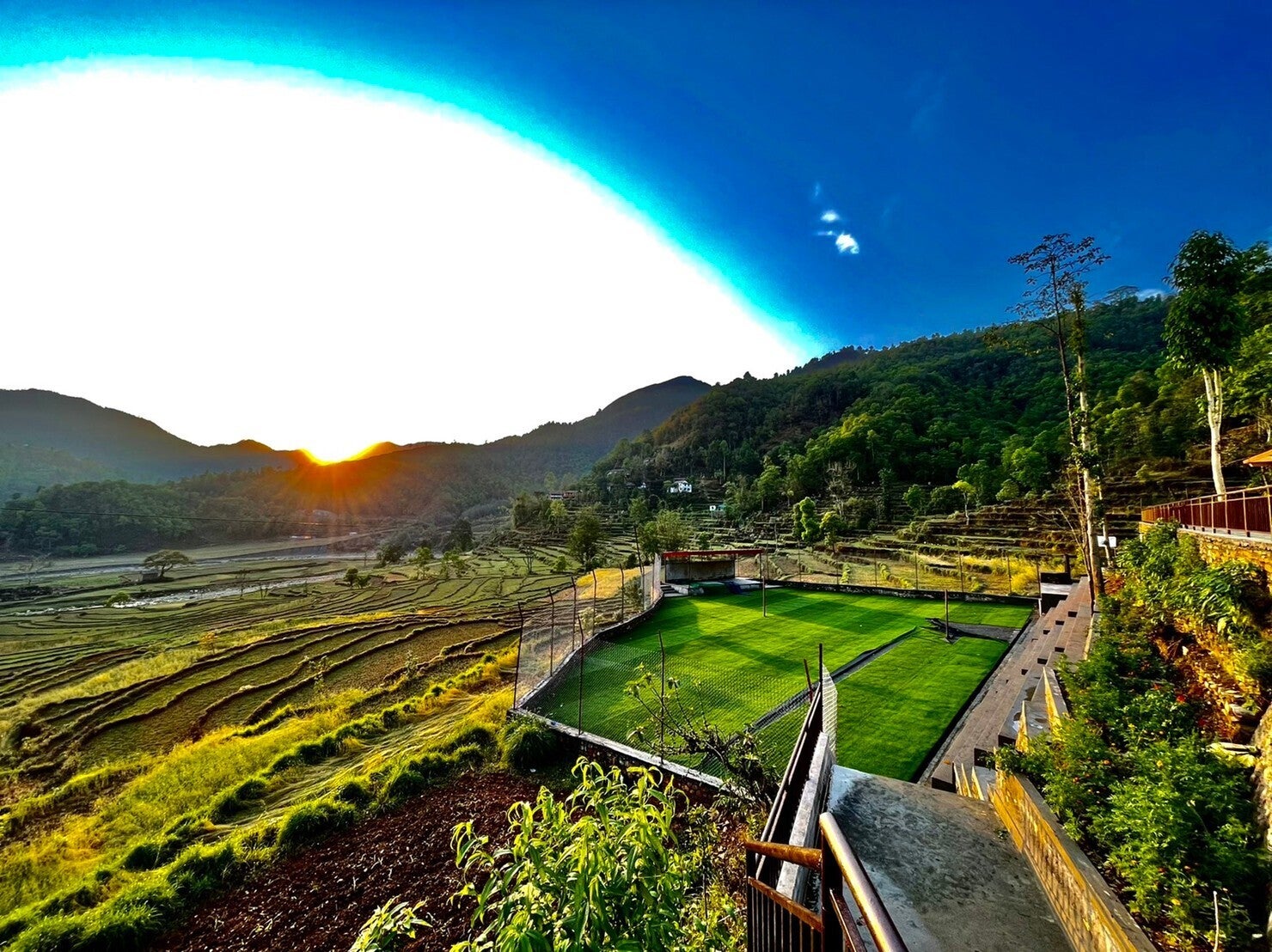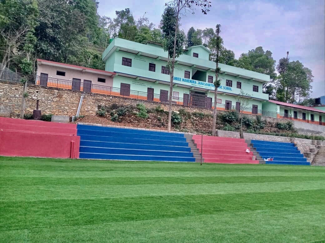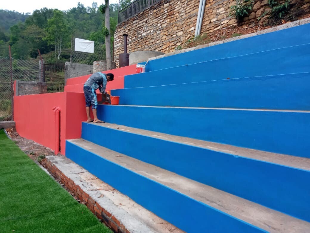 グランドの観客席に赤と青の色がつきました。赤と青はネパールの国旗の色からきています。