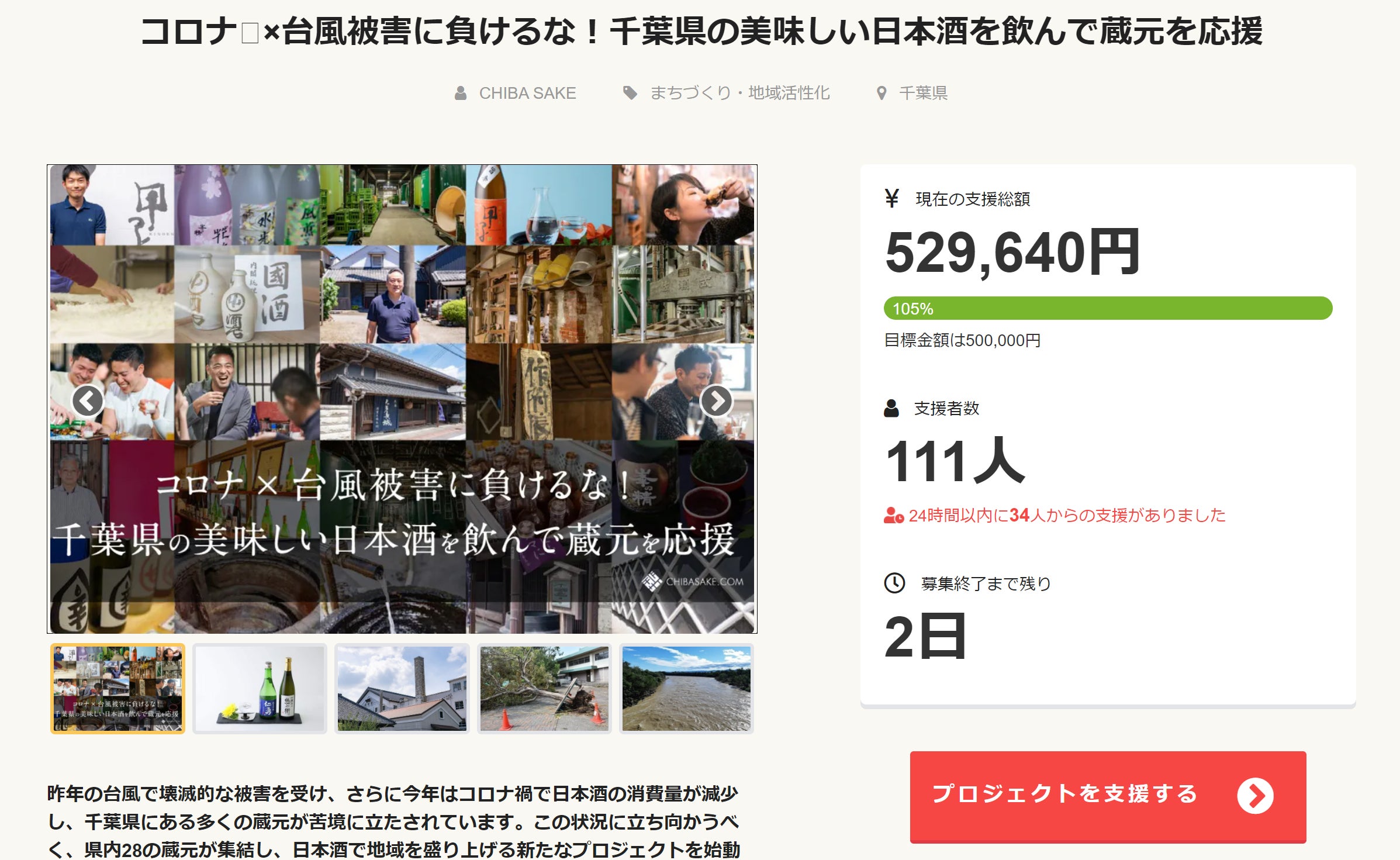 2020/09/29 09:51プロジェクトを支援して頂いている皆様、応援して下さっている皆様、いつも本当にありがとうございます。短い期間でしたが、ついに本日、クラウドファンディングの最終日となりました。既に134人もの皆様にご支援をいただき、本当にありがとうございます。ご紹介しきれないほど多くの応援コメントもありがとうございます。とても励みになっています。皆様のご支援をもとに、より多くの人に千葉のお酒を楽しんでもらえるよう、最後まで告知活動、頑張りたいと思います。■プロジェクト状況(9月29日9時30分時点)支援総額 :625,720円目標達成率:125%支援者数 :134人最後になりますが、支援を頂いている皆様に更なるお願いです。よろしければ、本プロジェクトの拡散や、お知り合いへのご紹介等をして頂けると大変幸いです。 全国の一人でも多くの人に届くことを願っています。どうぞよろしくお願いいたします。 もっと見る【残り2日】100%達成!ご支援ありがとうございます!最後までよろしくお願いします