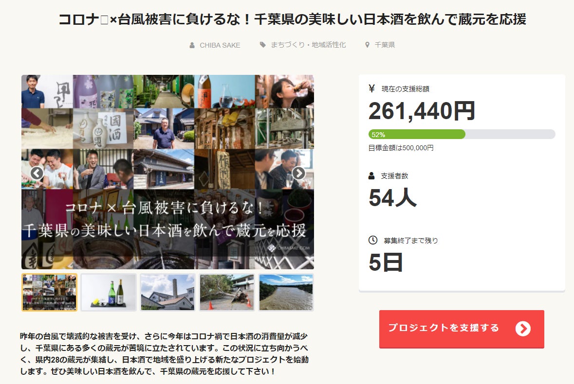 プロジェクトを支援して頂いている皆様、応援して下さっている皆様、いつも本当にありがとうございます。短い期間でしたが、ついに本日、クラウドファンディングの最終日となりました。既に134人もの皆様にご支援をいただき、本当にありがとうございます。ご紹介しきれないほど多くの応援コメントもありがとうございます。とても励みになっています。皆様のご支援をもとに、より多くの人に千葉のお酒を楽しんでもらえるよう、最後まで告知活動、頑張りたいと思います。■プロジェクト状況(9月29日9時30分時点)支援総額 :625,720円目標達成率:125%支援者数 :134人最後になりますが、支援を頂いている皆様に更なるお願いです。よろしければ、本プロジェクトの拡散や、お知り合いへのご紹介等をして頂けると大変幸いです。 全国の一人でも多くの人に届くことを願っています。どうぞよろしくお願いいたします。