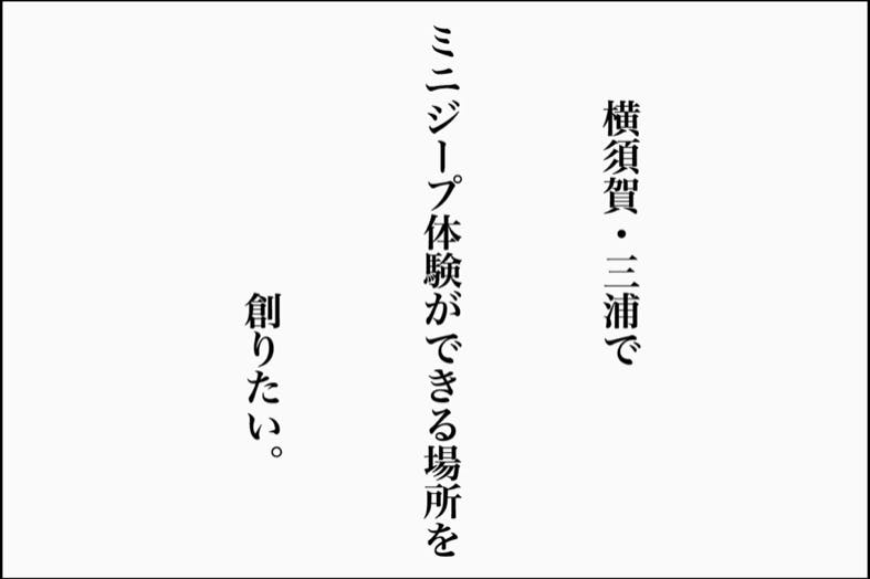 はじめまして。私は現在、横須賀・三浦で「ミニジープ」が体験できる場所を創るべく、準備を進めております。本プロジェクトを立ち上げたきっかけや内容については、読み進めていただくと記載してありますので、お時間があればご覧ください。