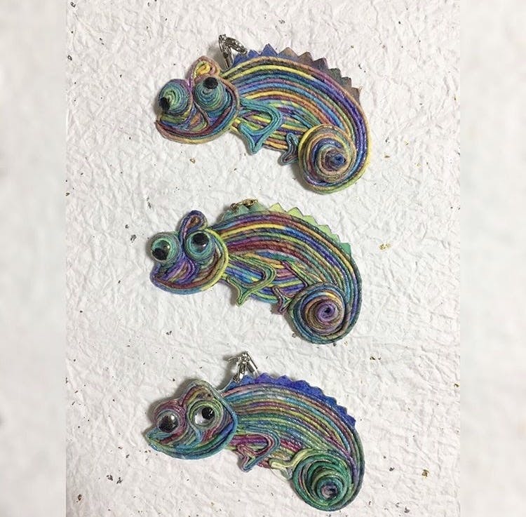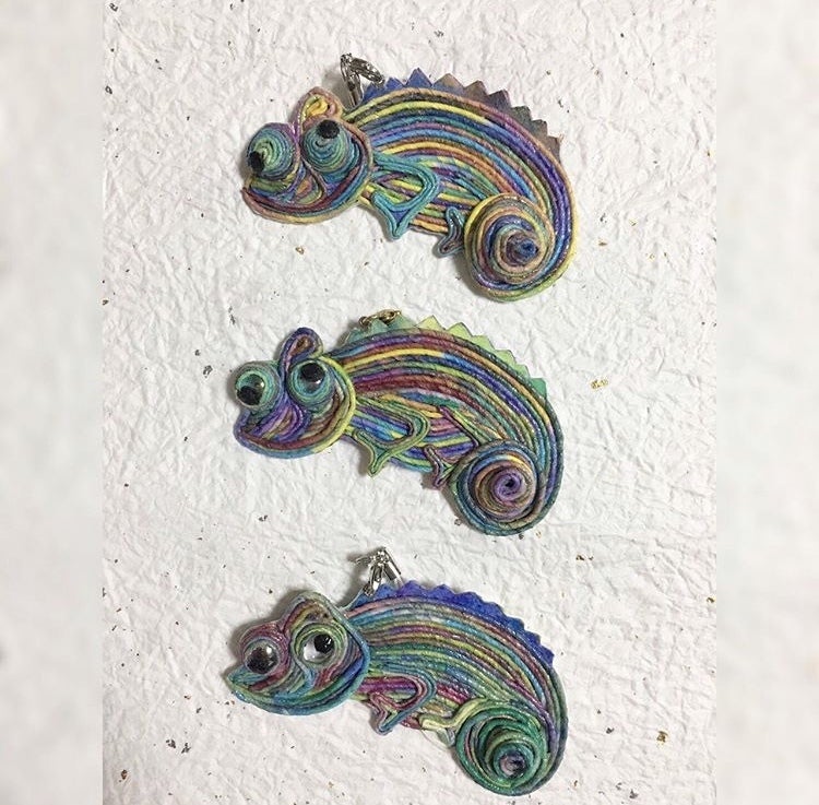 ⬇︎同じく染めた和紙をこよりにして作った、レオンくんのストラップ。