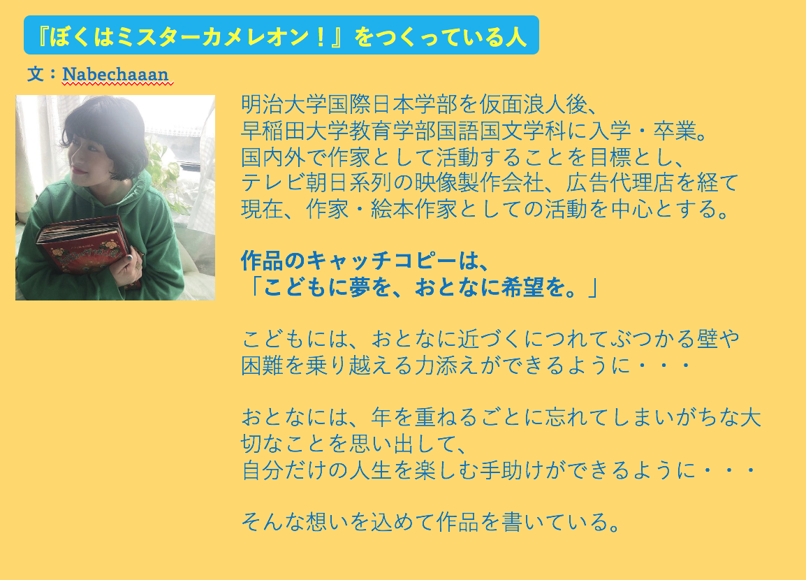 わたしは、「こどもに夢を、おとなに希望を。」をテーマに作品を書いている絵本作家のNabechaaanと申します。