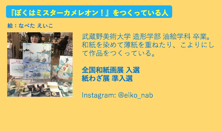 まだまだスタート地点に立ったばかりではありますが、今まで『ぼくはミスターカメレオン!』を読んだ方から「自分の個性に自信が持てました!」「娘の大好きな絵本になりました!」等の感想を頂く度に、本当に、涙が出るくらい嬉しくなります。