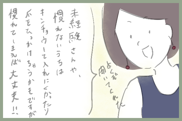 シリコンなのでタンポンより少し固いので最初は怖いかもしれませんが、水などで濡らすと入りやすいです。