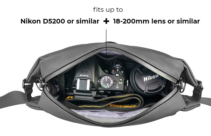 Nikon D5200(約129.0×98.0×78.0mm)とレンズ(約77mm×96.5mm)が入る大容量。