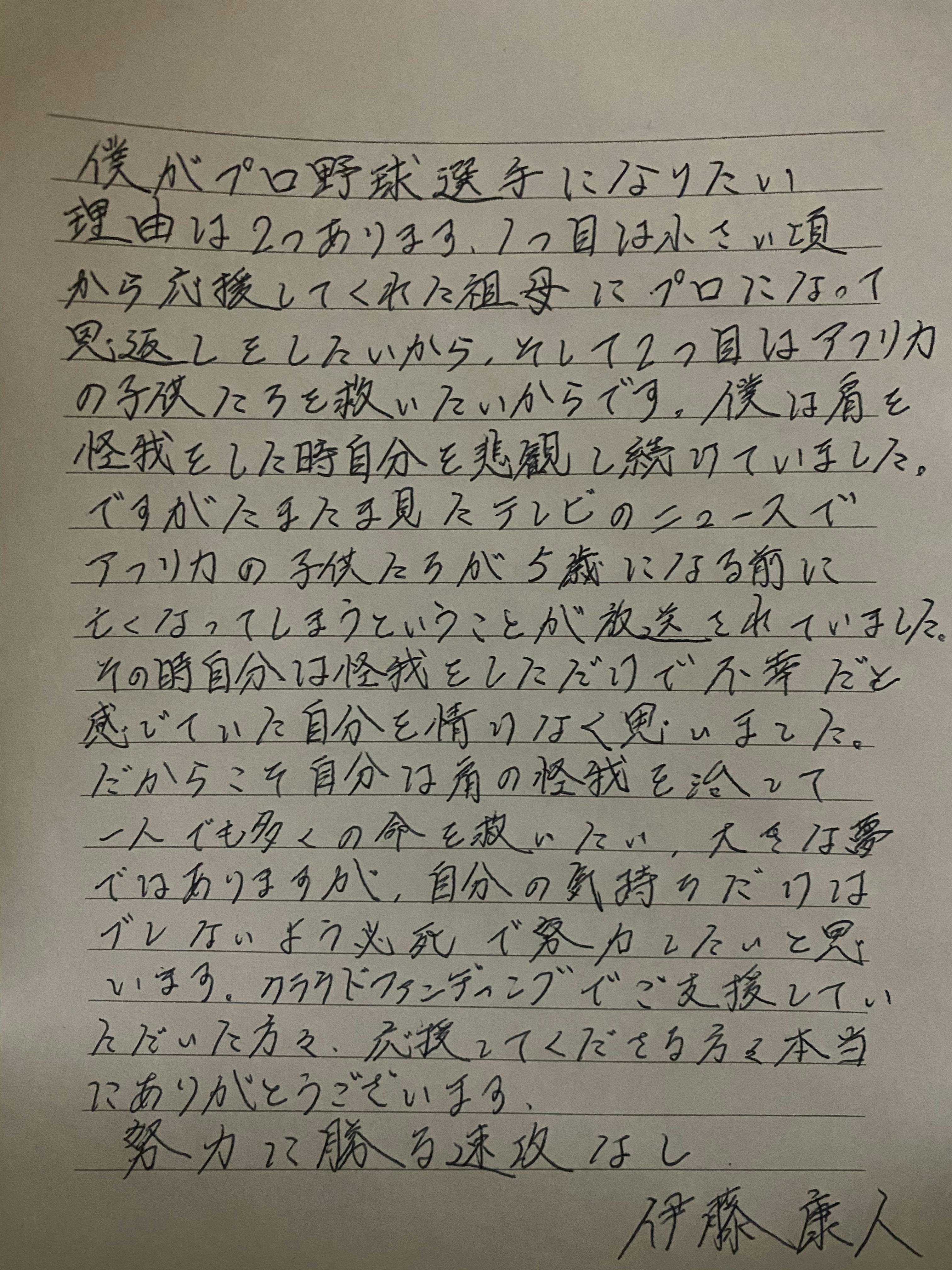 私は自分がプロ野球選手になることで怪我で苦しんでスポーツを辞めようとしてる人や私の祖母のように病気で苦しんでる人を励ましていきたいと思っています。