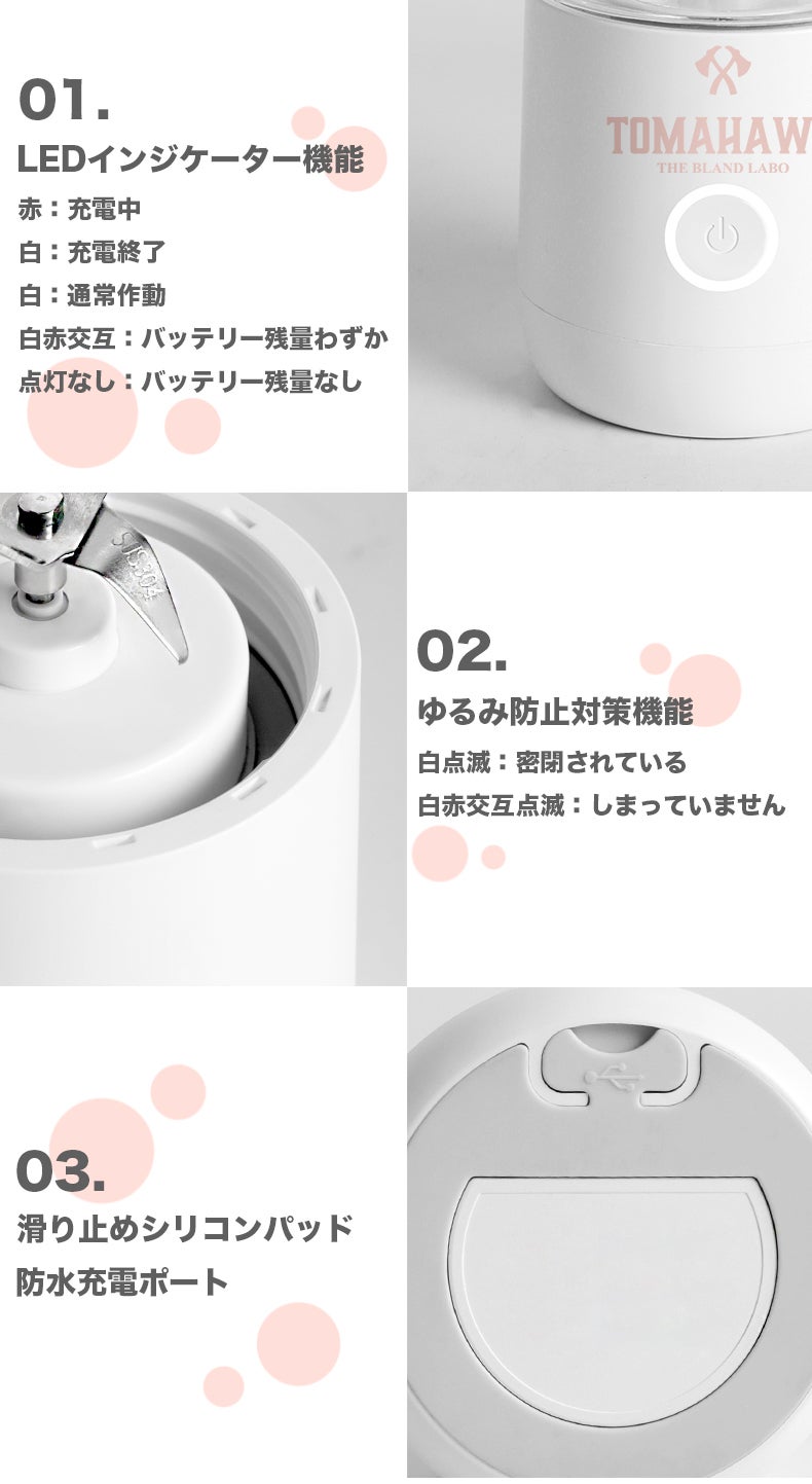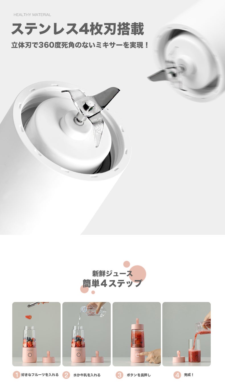 ・POINT1 コードレスでいつでもどこでも簡単に新鮮なジュースができるコンパクトミキサー!