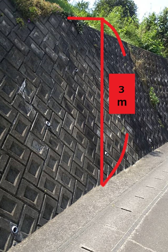 赤い線の真下にいたので、高さ3m程の擁壁(ようへき)から落下したのではないかと思います。
