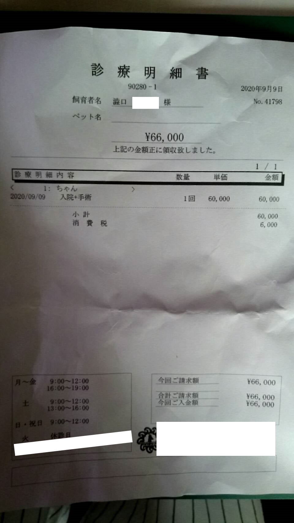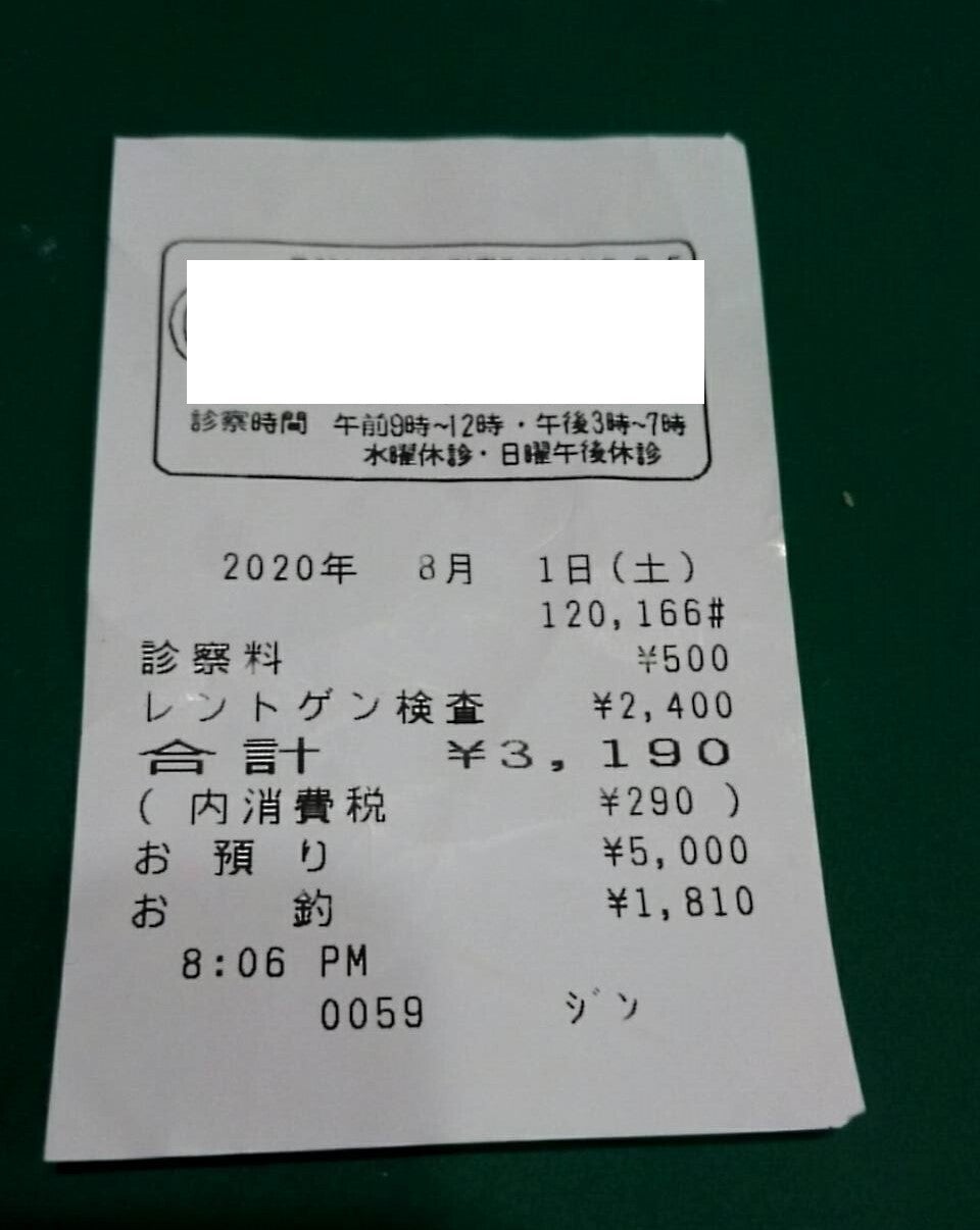 保護した当日、町の病院で見て頂いた領収書