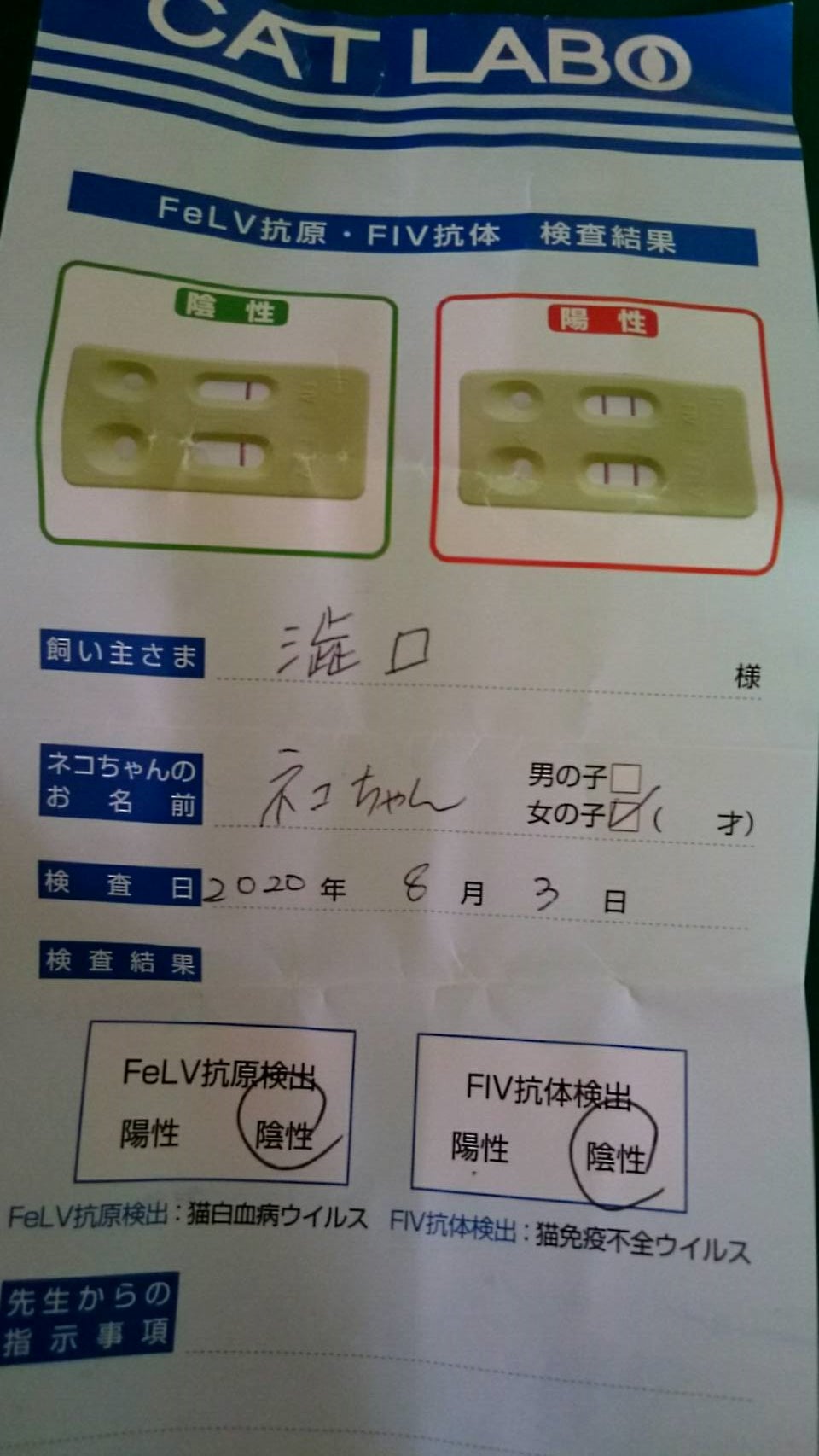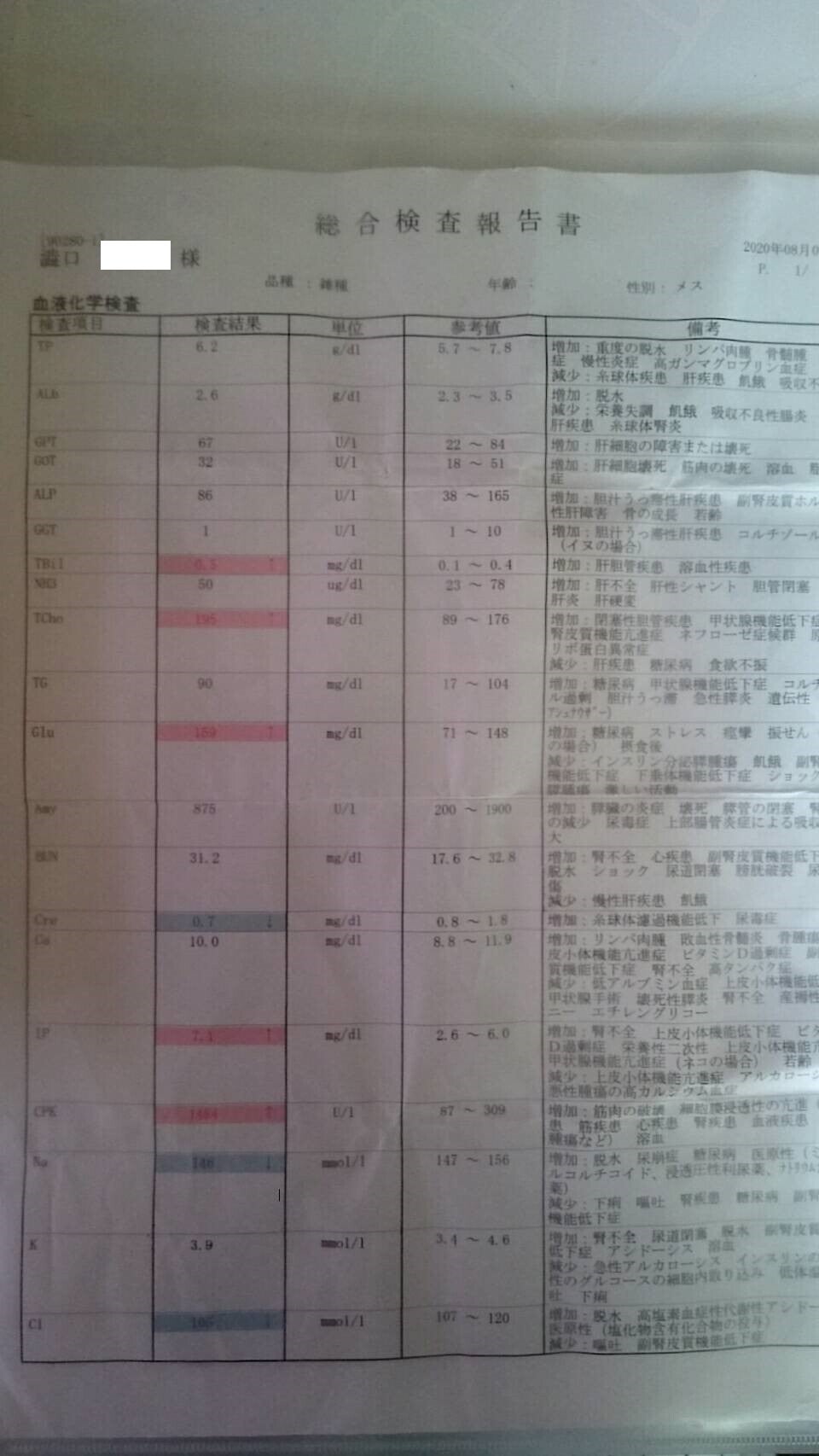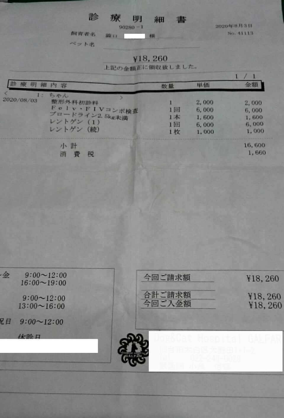 手術をして頂いた病院の初診・猫エイズ、血液検査、レントゲン領収書