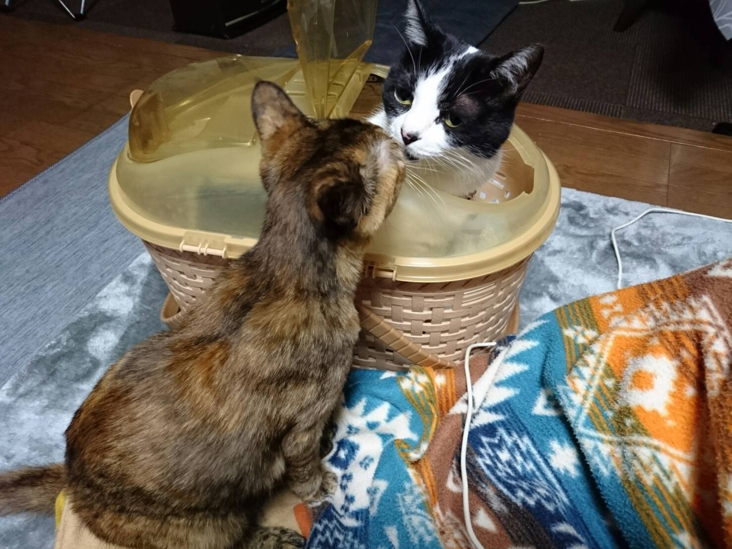 かごの蓋を開けたらいつの間にか白猫マックが入って待っていました。