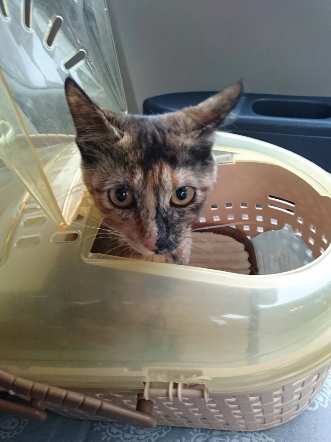 やはり動物病院と聞き、緊張を隠せないサビ猫ナッツです。