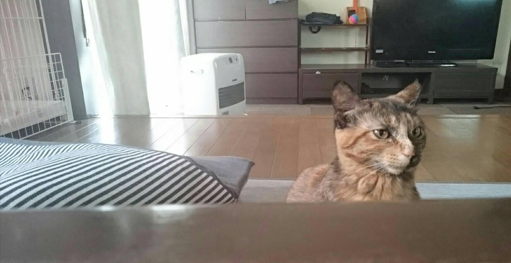 目の先には私が座っているのですが、ドライヤーが終わるまでずっとこんな顔です。