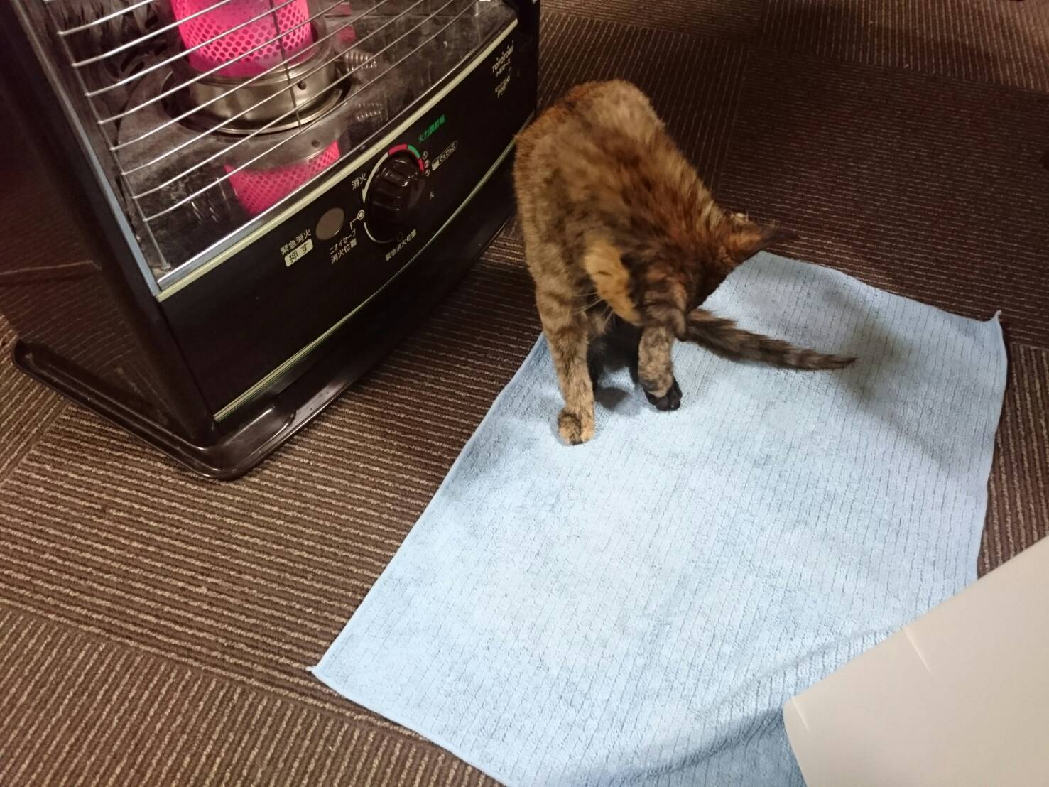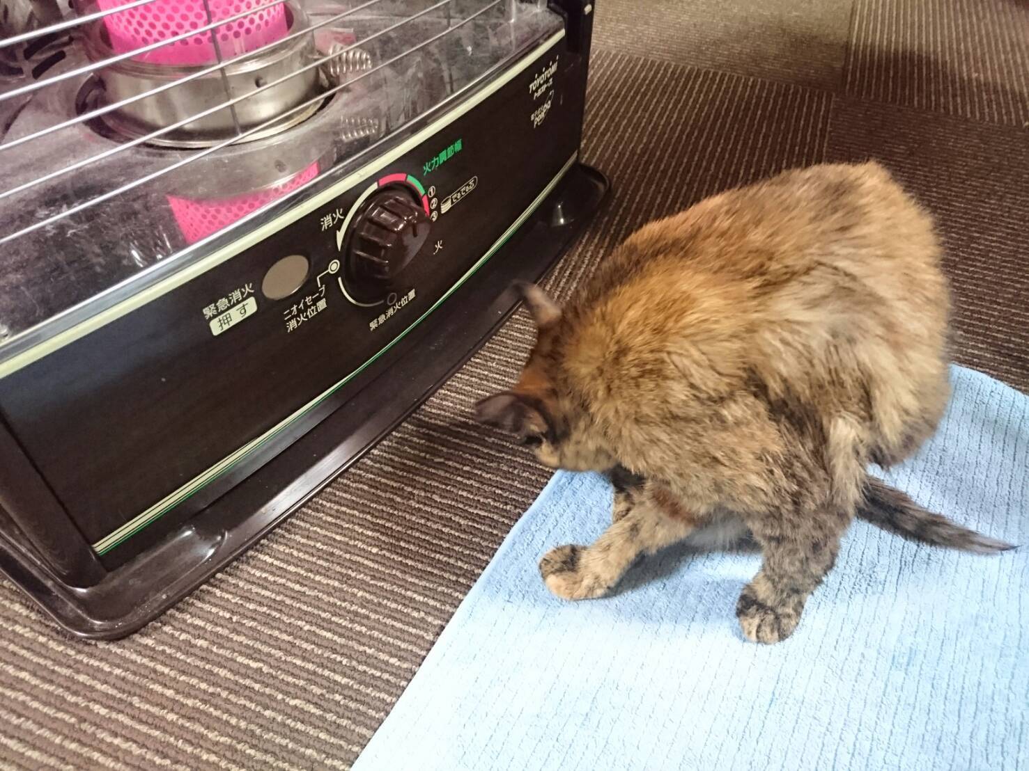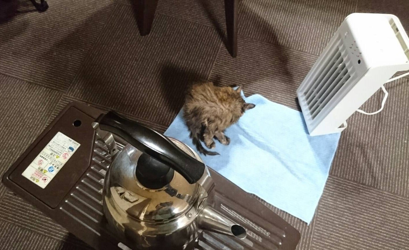 部屋は十分暖かくしていたのですが、ドライヤーを使えないので我が家の暖房器具の総力を上げ、サビ猫ナッツの濡れた体を乾かしました。